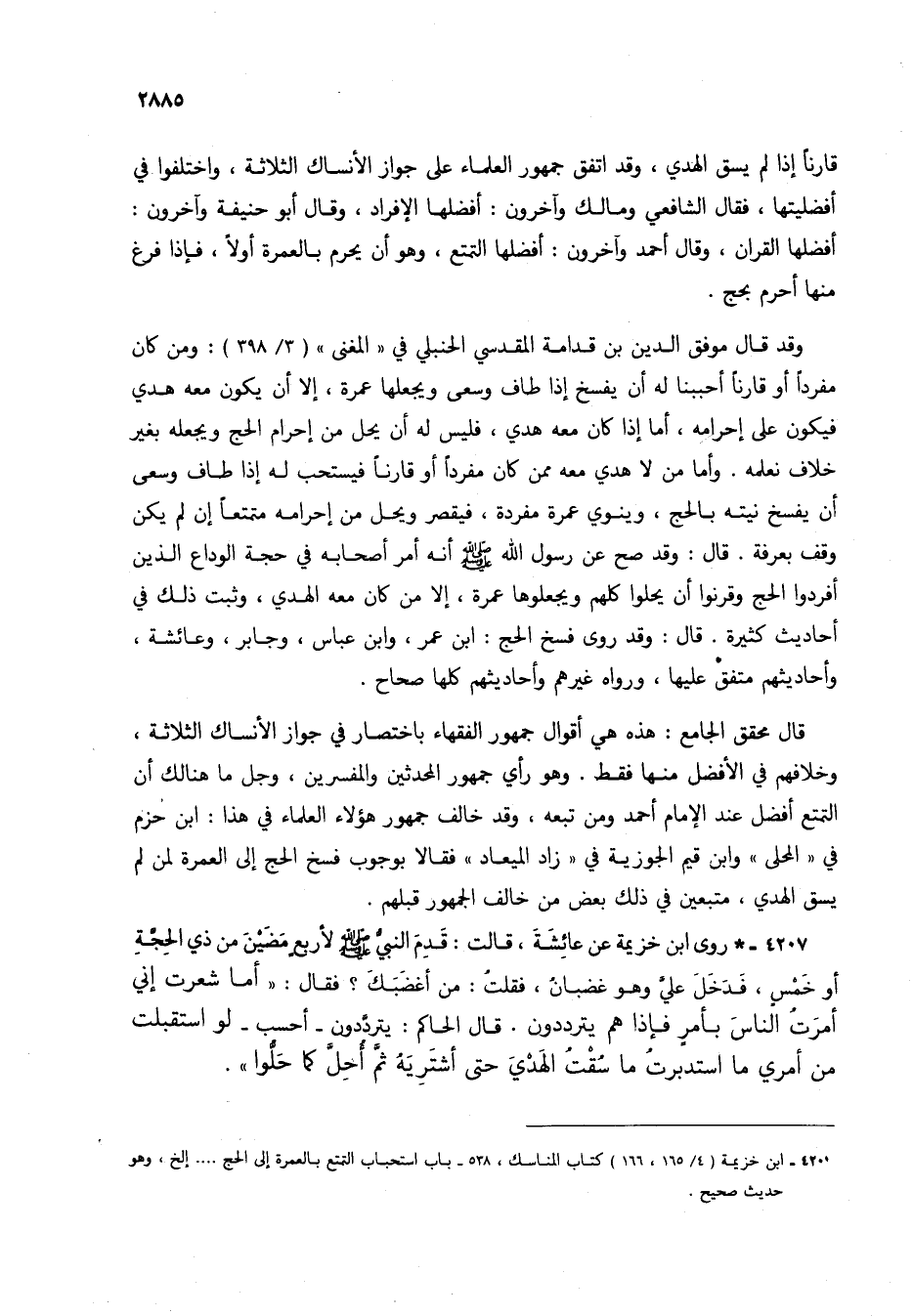قال محقق الجامع: هذه هي أقوال جمهور الفقهاء باختصار في جواز الأنساك الثلاثة، وخلافهم في الأفضل منها فقط. وهو رأي جمهور المحدثين والمفسرين، وجل ما هنالك أن التمتع أفضل عند الإمام أحمد ومن تبعه، وقد خالف جمهور هؤلاء العلماء في هذا: ابن حزم في "المحلى" وابن قيم الجوزية في "زاد الميعاد" فقالا بوجوب فسخ الحج إلى العمرة لمن لم يسق الهدي، متبعين في ذلك بعض من خالف الجمهور قبلهم.