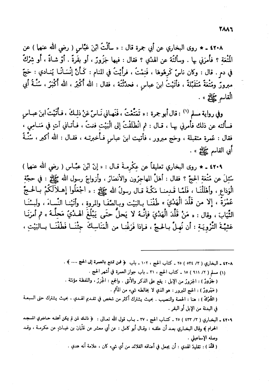4208 - * روى البخاري عن أبي جمرة قال: "سألت ابن عباس (رضي الله عنهما) عن المتعة؟ فأمرني بها. وسألته عن الهدي؟ فقال: فيها جزور، أو بقرة. أو شاة، أو شرك في دم. قال: وكان ناس كرهوها، فنمت، فرأيت في المنام: كأن إنساناً ينادي: حج مبرور ومتعة متقبلة، فأتيت ابن عباس، فحدثته، فقال: الله أكبر، الله أكبر، سُنَّة أبي القاسم صلى الله عليه وسلم".
