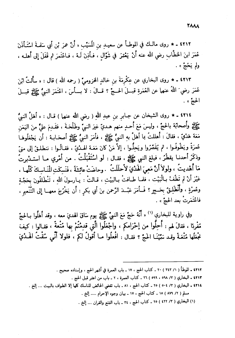 4212 - * روى مالك في الموطأ عن سعيد بن المسيب "أن عمر بن أبي سلمة استأذن عمر ابن الخطاب رضي الله عنه أن يعتمر في شوال، فأذن له، فاعتمر ثم قفل إلى أهله، ولم يحج".