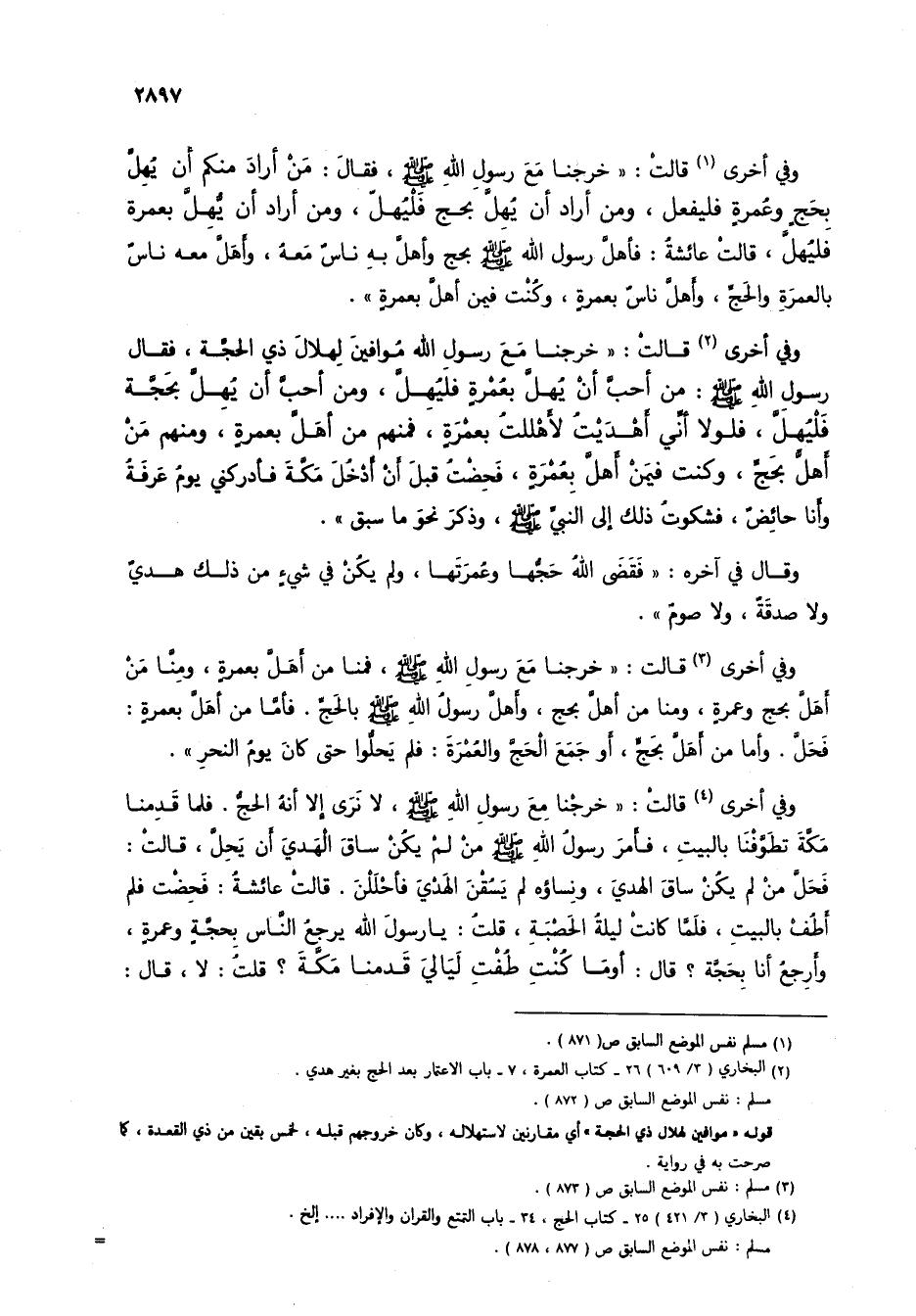 وفي أخرى (2) قالت: "خرجنا مع رسول الله موافقين لهلال ذي الحجة، فقال رسول الله صلى الله عليه وسلم: من أحب أن يهل بعمرة فليهل، ومن أحب أن يهل بحجة فليهل، فلولا أني أهديت لأهللت بعمرة، فمنهم من أهل بعمرة، ومنهم من أهل بحج، وكنت فيمن أهل بعمرة، فحضت قبل أن أدخل مكة فأدركني يوم عرفة وأنا حائض، فشكوت ذلك إلى النبي صلى الله عليه وسلم، وذكر نحو ما سبق".