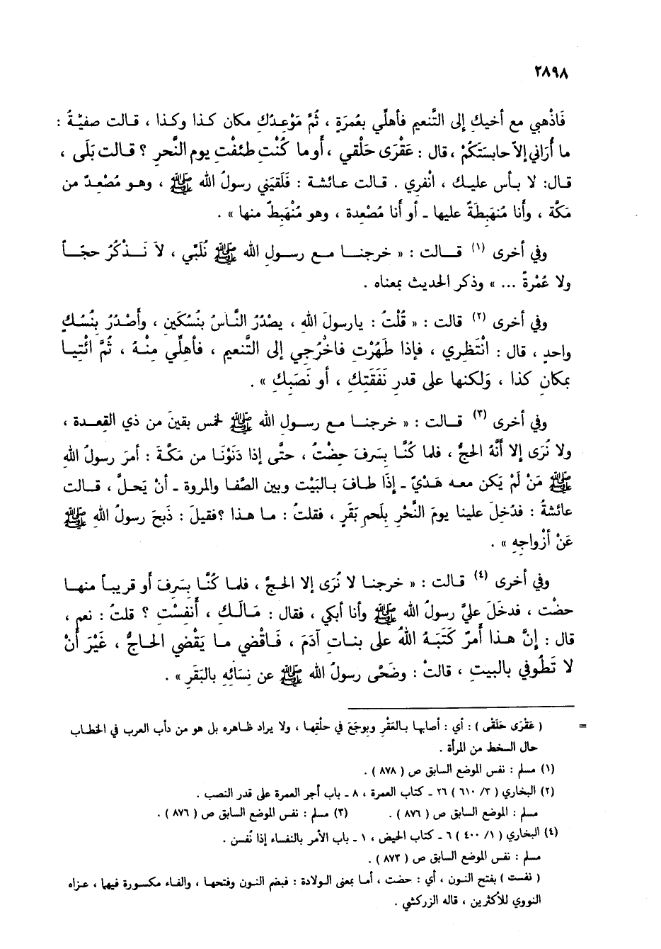 وفي أخرى (4) قالت: "خرجنا لا نرى إلا الحج، فلما كنا بسرف أو قريباً منها حضت، فدخل علي رسول الله صلى الله عليه وسلم وأنا أبكي، فقال: مالك، أنفست؟ قلت: نعم، قال: إن هذا أمر كتبه الله على بنات آدم، فاقضي ما يقضي الحاج، غير أن لا تطوفي بالبيت، قالت: وضحى رسول الله صلى الله عليه وسلم عن نسائه بالبقر".
