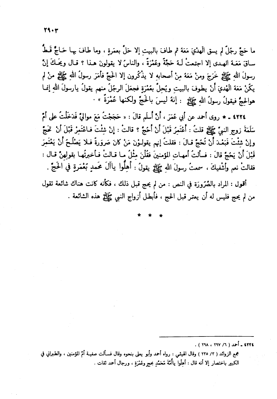 4224 - * روى أحمد عن أبي عمر، أن أسلم قال: "حججت مع موالي فدخلت على أم سلمة زوج النبي صلى الله عليه وسلم قلت: أعتمر قبل أن أحج؟ قالت: إن شئت فاعتمر قبل أن تحج وإن شئت فبعد أن تحج قال: فقلت إنهم يقولون من كان صرورة فلا يصلح أن يعتمر قبل أن يحج قال: فسألت أمهات المؤمنين فقلن مثل ما قالت فأخبرتها بقولهن قال: فقالت نعم وأشفيك، سمعت رسول الله صلى الله عليه وسلم يقول: أهلوا يا آل محمد بعمرة في الحج.