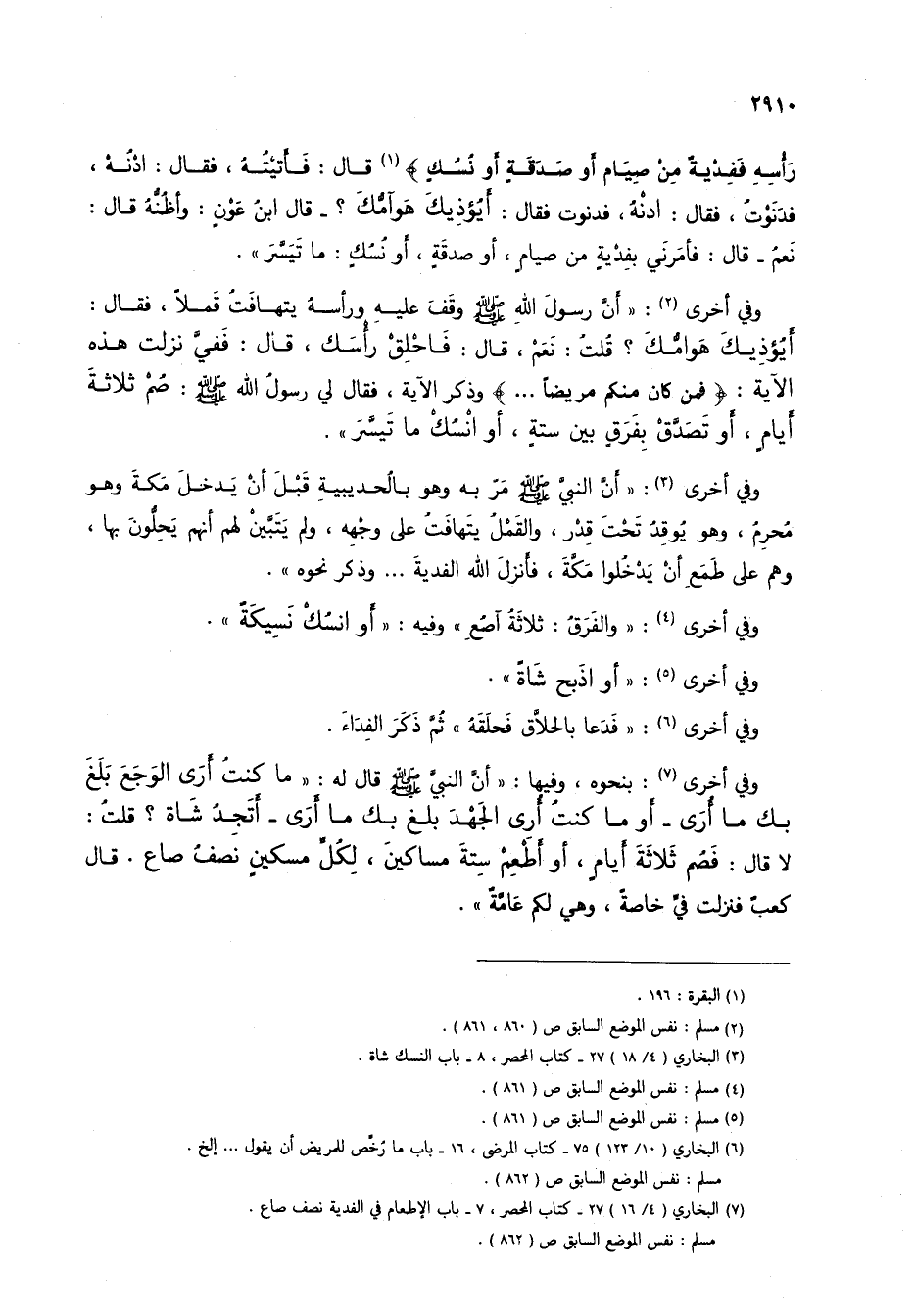 وفي أخرى (2): "أن رسول الله صلى الله عليه وسلم وقف عليه ورأسه يتهافت قملاً، فقال: أيؤذك هوامك؟ قلت: نعم، قال: فاحلق رأسك، قال: ففي نزلت هذه الآية: {فَمَنْ كَانَ مِنْكُمْ مَرِيضًا ...} وذكر الآية، فقال لي رسول الله صلى الله عليه وسلم: صم ثلاثة أيام، أو تصدق بفرق بين ستة، أو انسك ما تيسر".