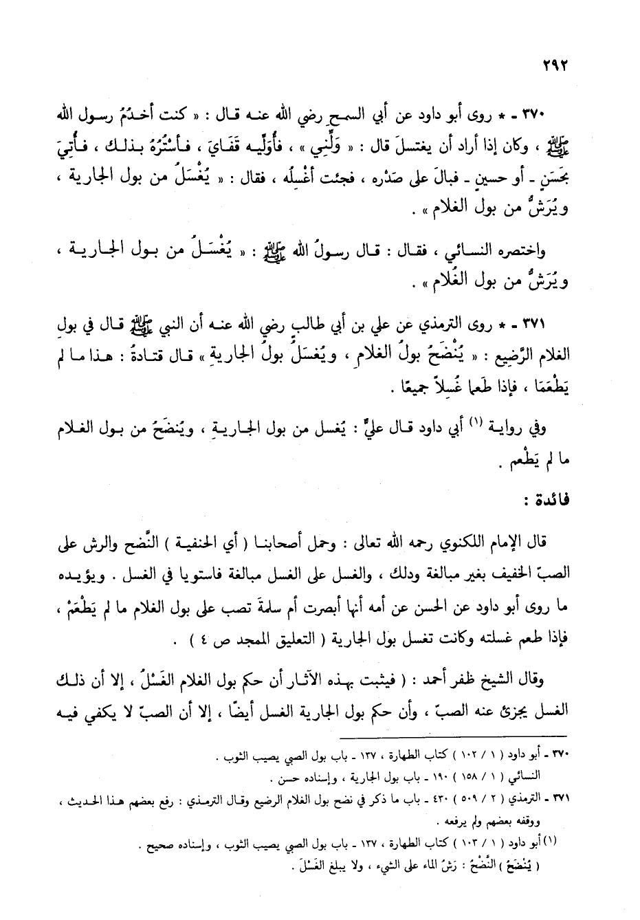 قال الإمام اللكنوي رحمه الله تعالى: وحمل أصحابنا (أي الحنفية) النَّضح والرش على الصب الخفيف بغير مبالغة ودلك، والغسل على الغسل مبالغة فاستويا في الغسل. ويؤيده ما روى أبو داود عن الحسن عن أمه أنها أبصرت أم سلمة تصب على بول الغلام ما لم يطْعَمْ، فإذا طعم غسلته وكانت تغسل بول الجارية (التعليق الممجد ص 4).