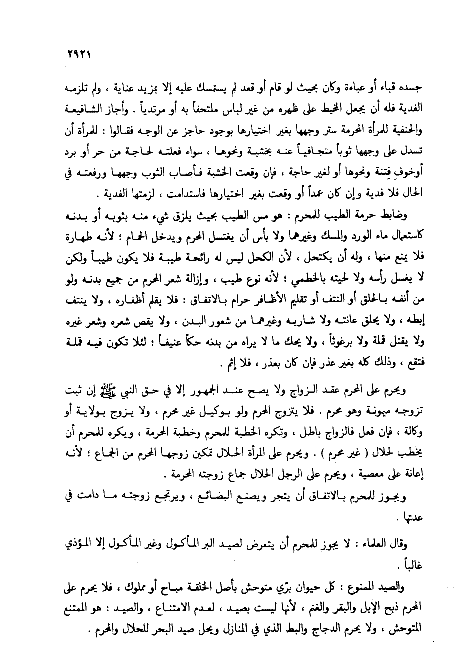 والصيد الممنوع: كل حيوان بري متوحش بأصل الخلقة مباح أو مملوك، فلا يحرم على المحرم ذبح الإبل والبقر والغنم، لأنها ليست بصيد، لعدم الامتناع، والصيد: هو الممتنع المتوحش، ولا يحرم الدجاج والبط الذي في المنازل ويحل صيد البحر للحلال والمحرم.
