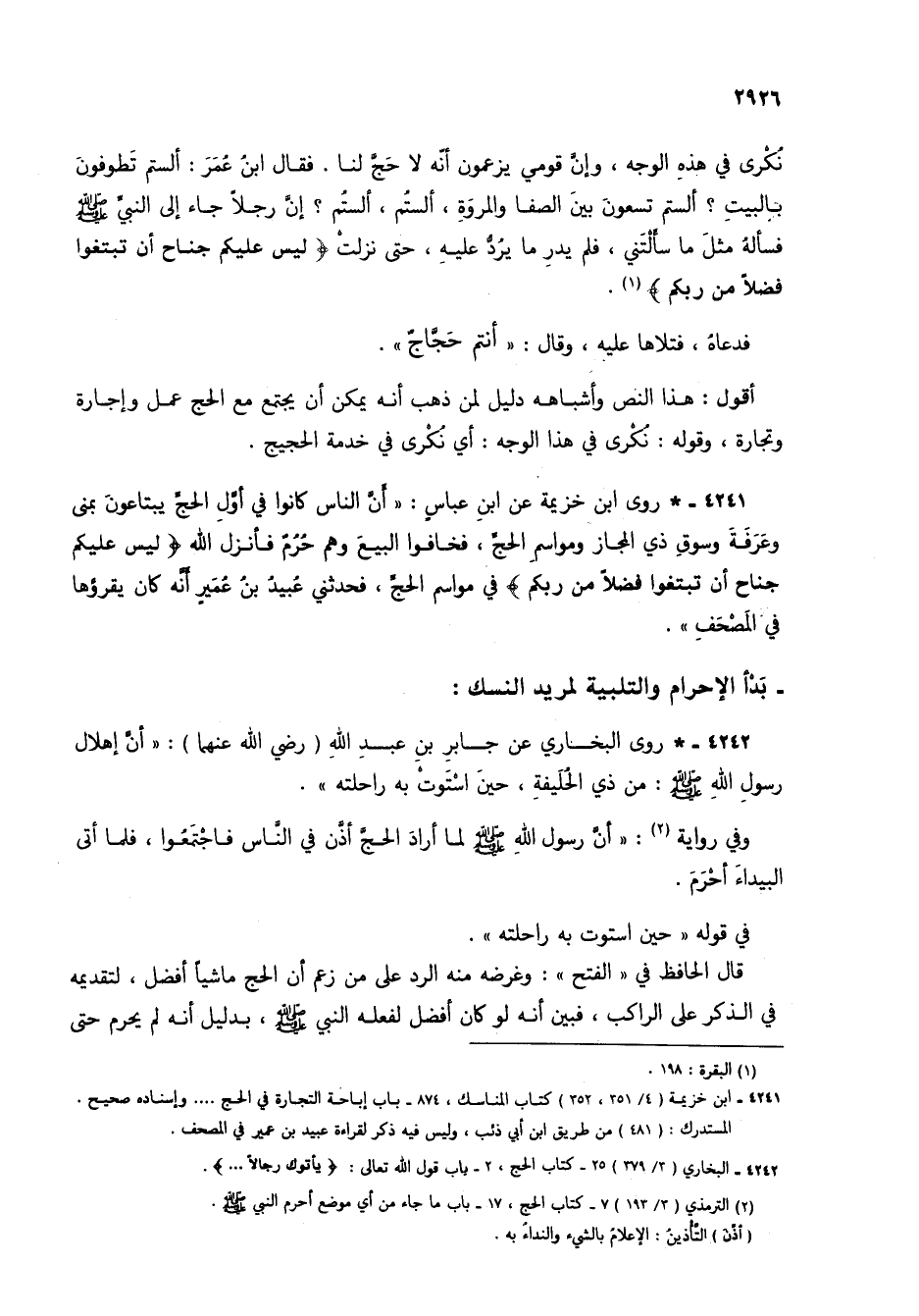 4241 - * روى ابن خزيمة عن ابن عباس: "أن الناس كانوا في أول الحج يبتاعون بمنى وعرفة وسوق ذي المجاز ومواسم الحج، فخافوا البيع وهم حرم فأنزل الله (ليس عليكم جناح أن تبتغوا فضلاً من ربكم) في مواسم الحج، فحدثني عبيد بن عمير أنه كان يقرؤها في المصحف".