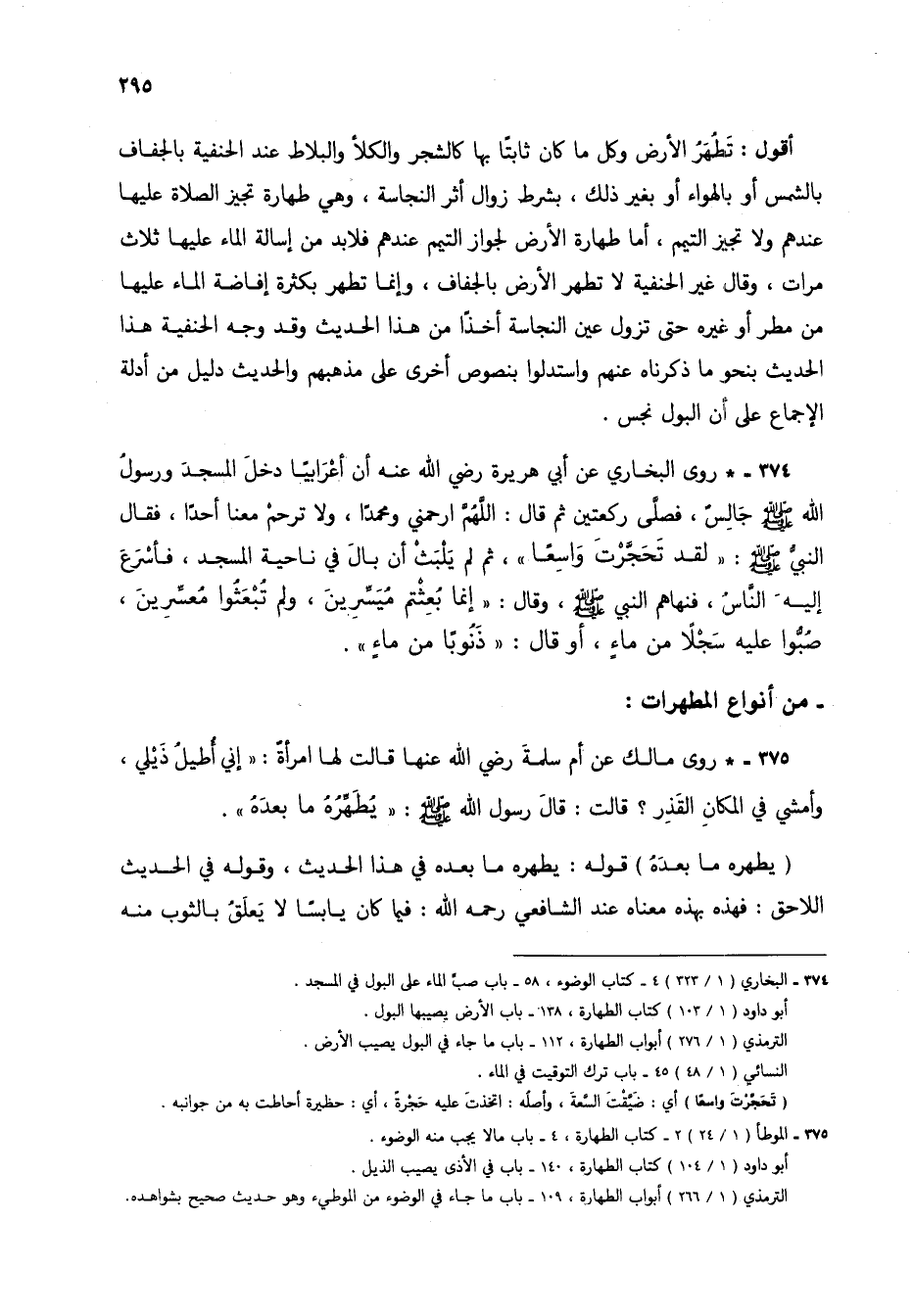 أقول: تطهرُ الأرض وكل ما كان ثابتاً بها كالشجر والكلأ والبلاط عند الحنيفة بالجفاف بالشمس أو بالهواء أو بغير ذلك، بشرط زوال أثر النجاسة، وهي طهارة تجيز الصلاة عليها عندهم ولا تجيز التيمم، أما طهارة الأرض لجواز التيمم عندهم فلابد من إسالة الماء عليها ثلاث مرات، وقال غير الحنفية لا تطهر الأرض بالجفاف، وإنما تطهر بكثرة إفاضة الماء عليها من مطر أو غيره حتى تول عين النجاسة أخذاً من هذا الحديث وقد وجه الحنفية هذا الحديث بنحو ما ذكرناه عنهم واستدلوا بنصوص أخرى على مذهبهم والحديث دليل من أدلة الإجماع على أن البول نجس.