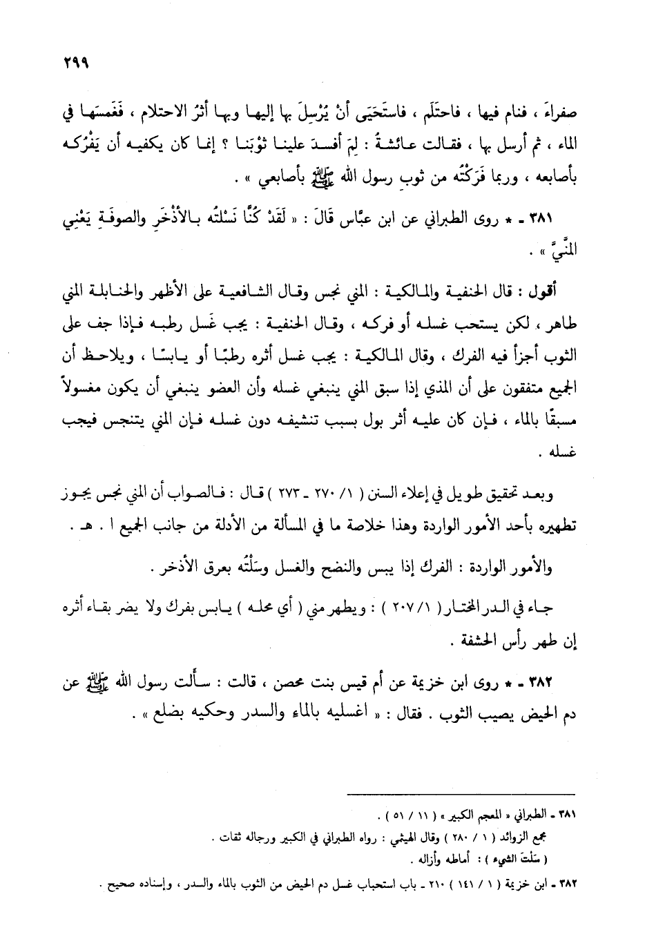 381 - * روى الطبراني عن ابن عباس قال: "لقد كنا نسْلتُه بالأذْخَرِ والصوفة يعني المني".