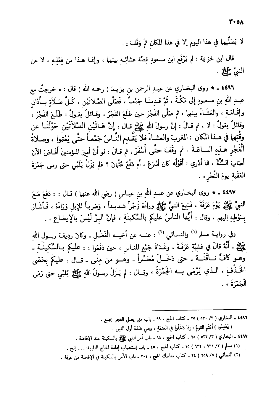4496 - * روى البخاري عن عبد الرحمن بن يزيد (رحمه الله) قال: "خرجتُ مع عبد الله بن مسعودٍ إلى مكة، ثم قدمنا جمعاً، فصلى الصلاتين، كل صلاةٍ بأذانٍ وإقامة، والعشاء بينهما، ثم صلى الفجر حين طلع الفجرُ، وقائلٌ يقول: طلع الفجر، وقائل يقول: لا، ثم قال: إن رسول الله صلى الله عليه وسلم قال: إن هاتين الصلاتين حُوِّلتا عن وقتهما في هذا المكان: المغرب والعشاء فلا يقدم الناسُ جمعاً حتى يُعتموا، وصلاة الفجر هذه الساعة. ثم وقف حتى أسفر، ثم قال: لو أن أمير المؤمنين أفاض الآن أصاب السُّنة، فما أدري: أقوله كان أسرعُ، أم دفعُ عثمان؟ فلم يزل يُلبي حتى رمى جمرة العقبة يوم النحر".