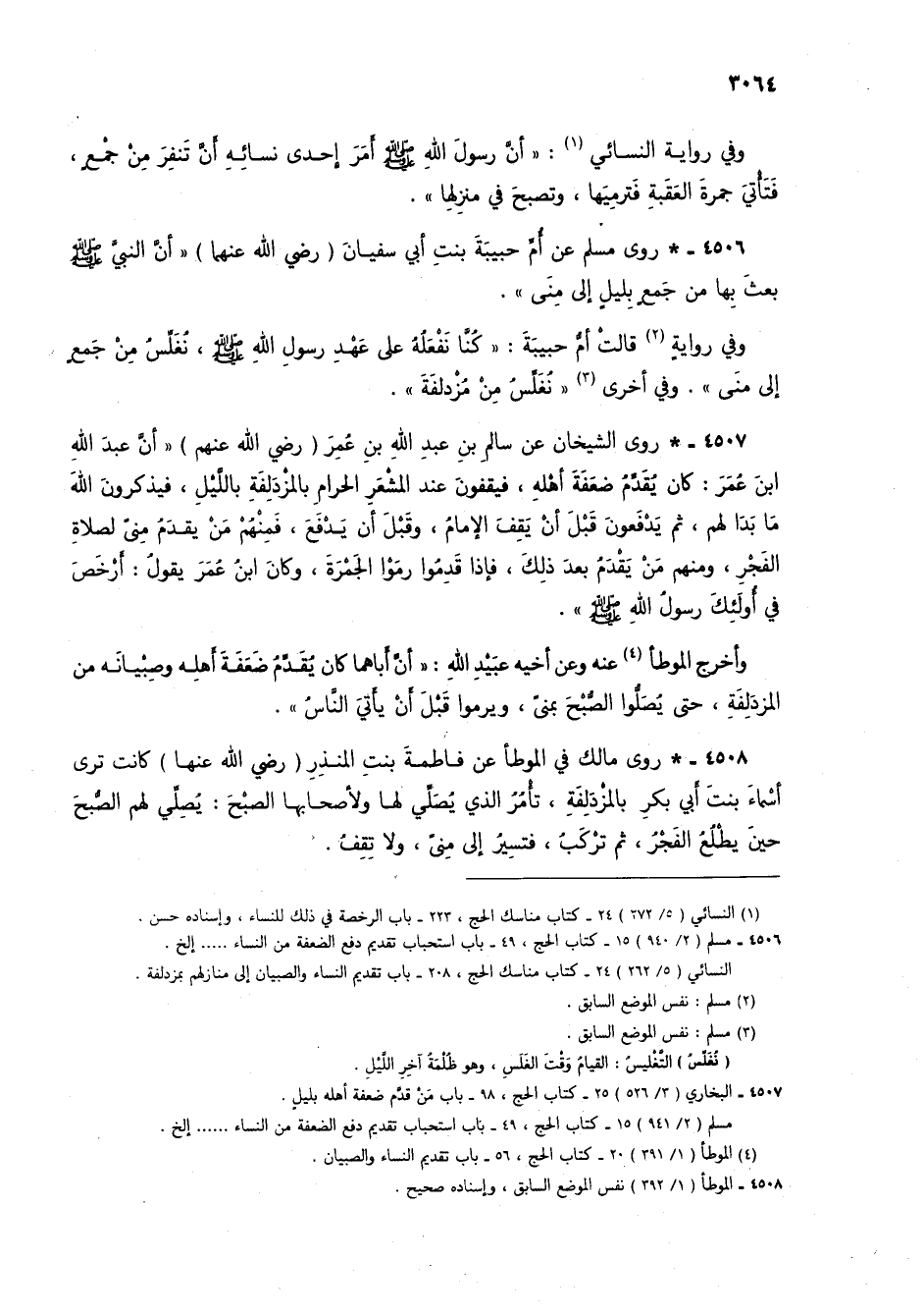 4506 - * روى مسلم عن أم حبيبة بنت أبي سفيان (رضي الله عنهما) "أن النبي صلى الله عليه وسلم بعث بها من جمعٍ بليلٍ إلى منى".