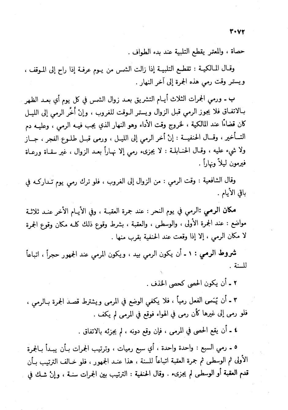 5 - رمى السبع: واحدة واحدة، أي سبع رميات، وترتيب الجمرات بأن يبدأ بالجمرة الأولى ثم الوسطى ثم جمرة العقبى اتباعاً للسنة، هذا عند الجمهور، فلو خالف الترتيب بأن قدم العقبة أو الوسطى لم يجزيء. وقال الحنفية: الترتيب بين الجمرات سنة، وإنْ شك في