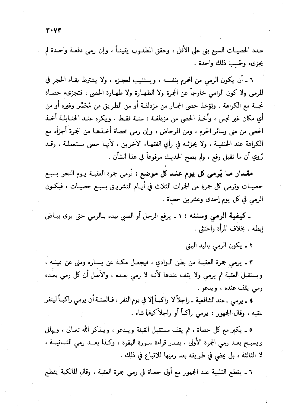 4 - يرمي - عند الشافعية- راجلاً لا راكباً إلا في يوم النفر، فالسنة أن يرمي راكباً لينفر عقبه، وقال الجمهور: يرمي راكباً أو راجلاً كيفما شاء.