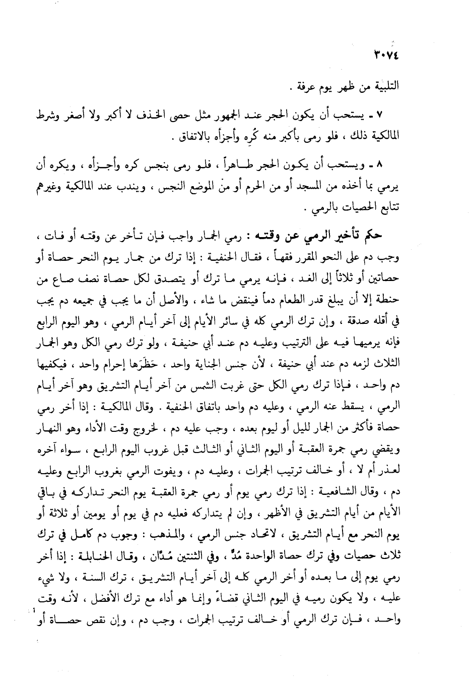 حكم تأخير الرمي عن وقته: رمي الجمار واجب فإن تأخر عن وقته أو فات، وجب دم على النحو المقرر فقهاً، فقال الحنفية: إذا ترك من جمار يوم النحر حصاة أو حصاتين أو ثلاثاً إلى الغد، فإنه يرمي ما ترك أو يتصدق لكل حصاة نصف صاع من حنطة إلا أن يبلغ قدر الطعام دماً فينقض ماشاء، والأصل أن ما يجب في جميعه دم يجب في أقله صدقة، وإن ترك الرمي كله في سائر الأيام إلى آخر أيام الرمي، وهو اليوم الرابع فإنه يرميها فيه على الترتيب وعليه دم عند أبي حنيفة، ولو ترك رمي الكل وهو الجمار الثلاث لزمه دم عند أبي حنيفة، لأن جنس الجناية واحد، حظَرَها إحرام واحد، فيكفيها دم واحد، فإذا ترك رمي الكل حتى غربت الشمس من آخر أيام التشريق وهو آخر أيام الرمي، يسقط عنه الرمي، وعليه دم واحد باتفاق الحنفية. وقال المالكية: إذا أخر رمي حصاة فأكثر من الجمار لليل أو ليوم بعده، وجب عليه دم، لخروج وقت الأداء وهو النهار ويقضي رمي جمرة العقبة أو اليوم الثاني أو الثالث قبل غروب اليوم الرابع، سواء آخره لعذر أم لا، أو خالف ترتيب الجمرات، وعليه دم، ويفوت الرمي بغروب الرابع وعليه دم، وقال الشافعية: إذا ترك رمي يوم أو رمي جمرة العقبة يوم النحر تداركه في باقي الأيام من أيام التشريق في الأظهر، وإن لم يتداركه فعليه دم في يوم أو يومين أو ثلاثة أو يوم النحر مع أيام التشريق، لاتحاد جنس الرمي، والمذهب: وجوب دم كامل في ترك ثلاث حصيات وفي ترك حصاة الواحدة مُدٌّ، وفي الثنتين مُدَّان، وقال الحنابلة: إذا أخر رمي يوم إلى ما بعده أو أخر الرمي كله إلى آخر أيام التشريق، ترك السنة، ولا شيء عليه، ولا يكون رميه في اليوم الثاني قضاء وإنما هو أداء مع ترك الأفضل، لأنه وقت واحد، فإن ترك الرمي أو خالف ترتيب الجمرات، وجب دم، وإن نقص حصاة أو