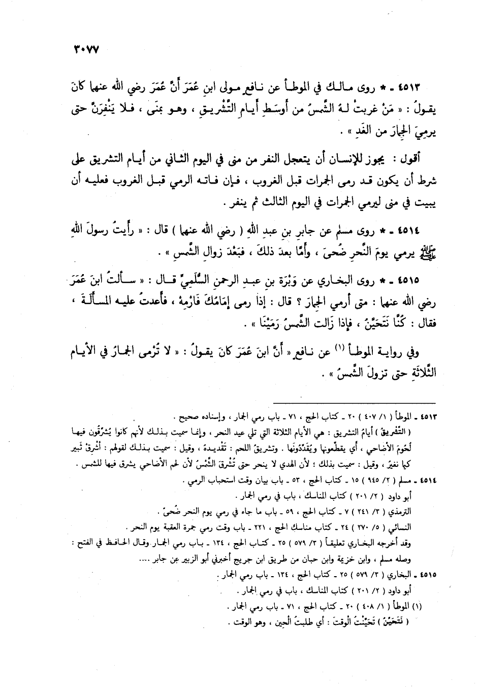 4513 - * روى مالك في الموطأ عن نافع مولى ابن عمر أن عمر رضي الله عنهما كان يقول: "من غربتْ له الشمسُ من أوسط أيام التشريق، وهو بمنى، فلا ينفِرَنَّ حتى يرمي الجمارَ من الغدِ".