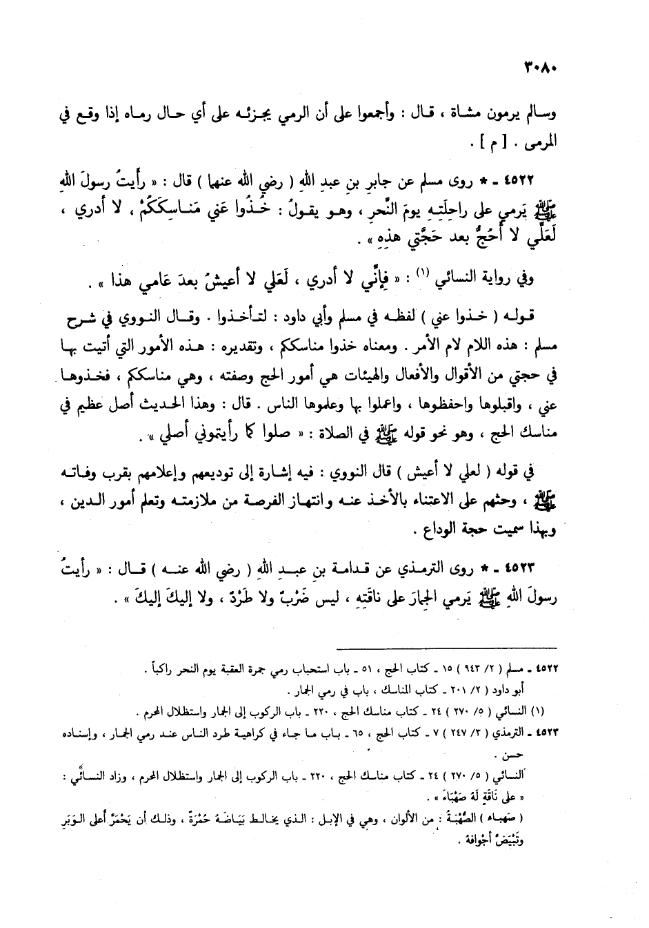 4522 - * روى مسلم عن جابر بن عبد الله (رضي الله عنهما) قال: "رأيتُ رسول الله صلى الله عليه وسلم يرمي على راحلته يوم النحر، وهو يقولُ: خُذوا عني مناسككُمْ، لا أدري، لعلي لا أحُجُّ بعد حجتي هذه".