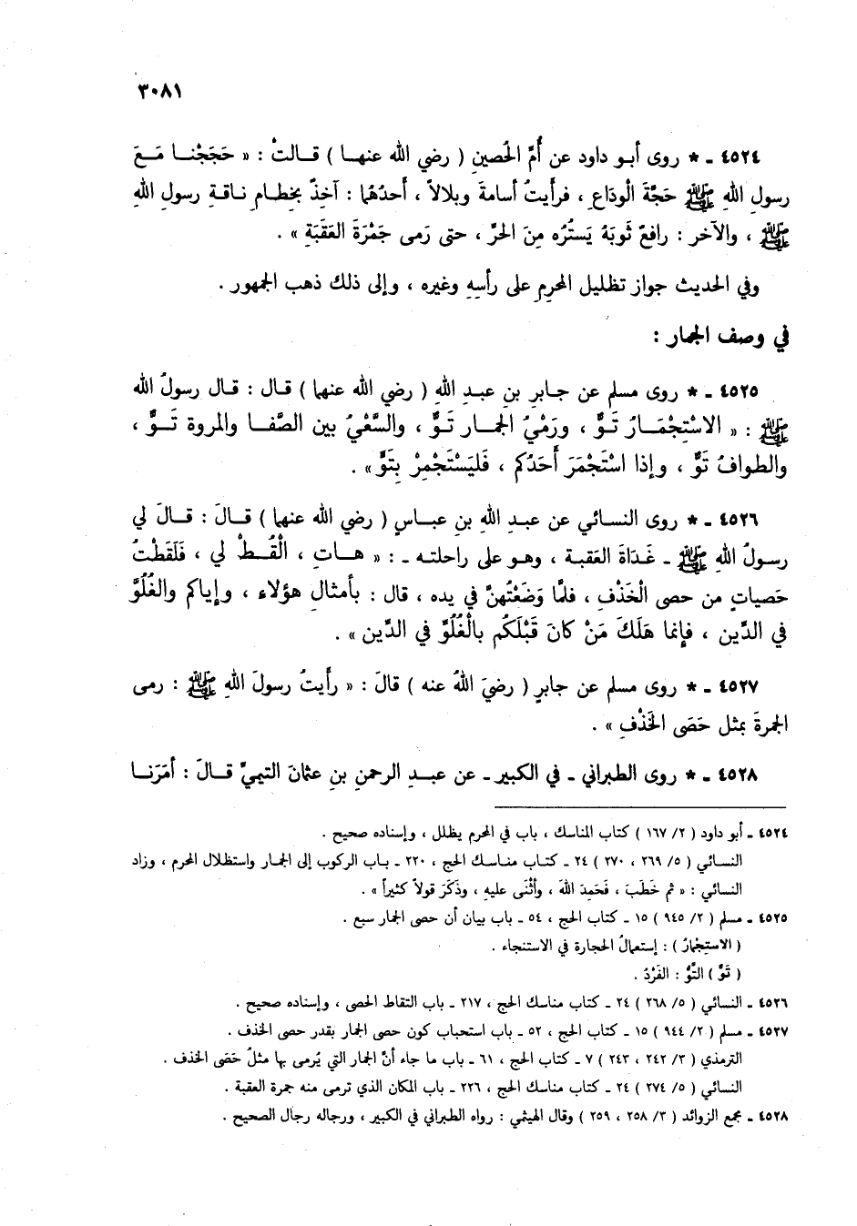 4527 - * روى مسلم عن جابرٍ (رضي الله عنه) قال: "رأيتُ رسول الله صلى الله عليه وسلم: رمى الجمرة بمثل حصى الخَذْفِ".