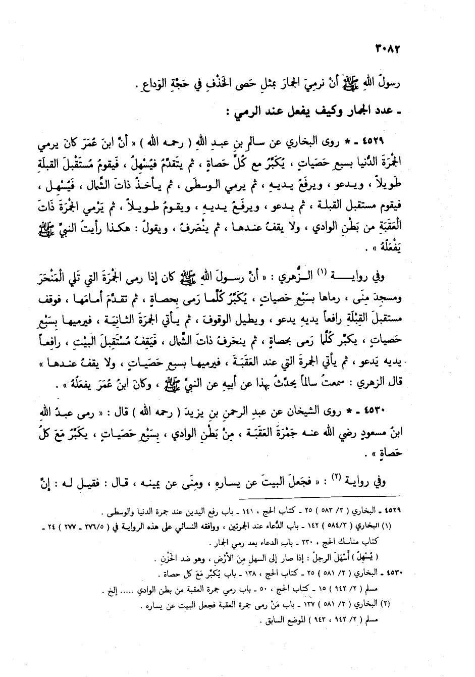 4530 - * روى الشيخان عن عبد الرحمن بن يزيد (رحمه الله) قال: "رمى عبدُ الله ابن مسعود رضي الله عنه جمرة العقبة، من بطنِ الوادي، بسبع حصياتٍ، يكبرُ مع كل حصاةٍ".