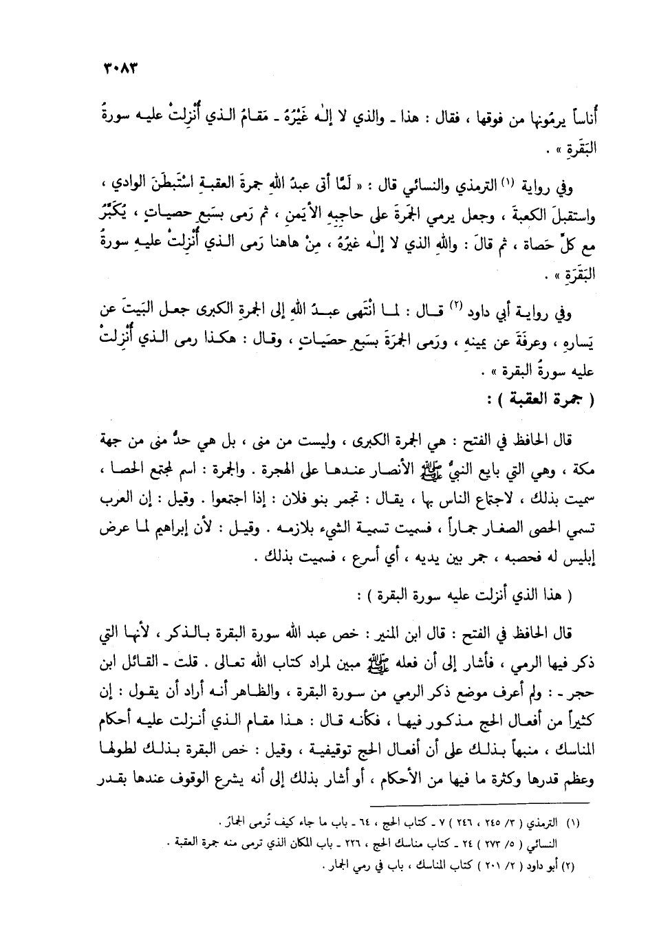 وفي رواية (1) الترمذي النسائي قال: "لمَّا أتى عبد الله جمرة العقبة استبطن الوادي، واستقبل الكعبة، وجعل يرمي الجمرة على حاجبه الأيمن، ثم رمى بسبع حصيات، يُكبر مع كل حصاة، ثم قال: والله الذي لا إله غيره، من هاهنا رمى الذي أنزلتْ عليه سورة البقرة".