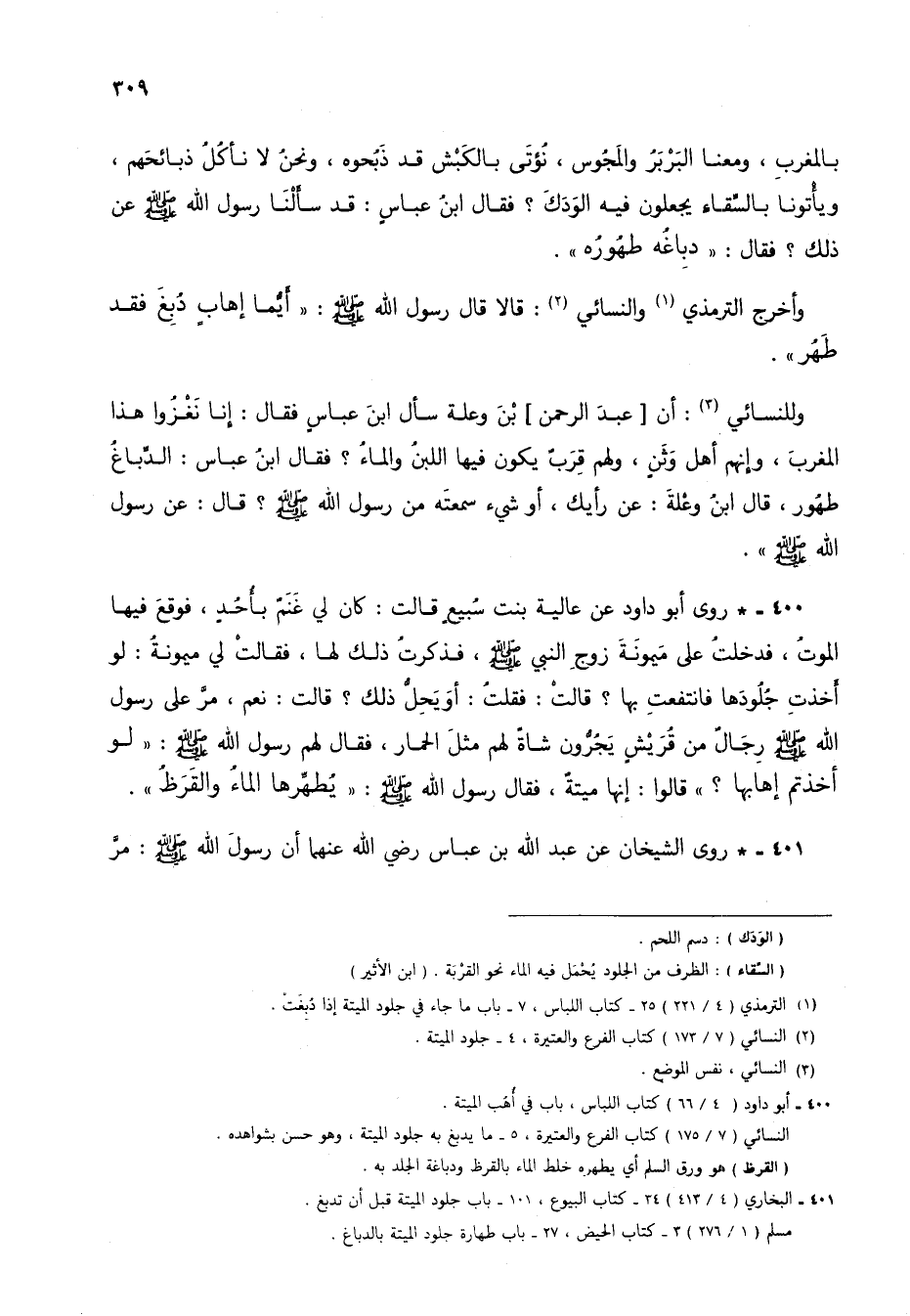 400 - * روى أبو داود عن عالية بنت سُبيعٍ قالت: كان لي غنمٌ بأُحُدٍ، فوقع فيها الموتُ، فدخلتُ على ميمونة زوج النبي صلى الله عليه وسلم، فذكرتُ ذلك لها، فقالت لي ميمونةُ: لو أخذت جُلودها فانتفعت بها؟ قالتْ: فقلت: أو يحلُّ ذلك؟ قالت: نعم، مرَّ على رسول الله صلى الله عليه وسلم رجالٌ من قريشٍ يجُرّثون شاةً لهم مثل الحمار، فقال لهم رسول الله صلى الله عليه وسلم: "لو أخذتم إهابها؟ " قالوا: إنها ميتةٌ، فقال رسول الله صلى الله عليه وسلم: "يُطهِّرها الماءُ والقَرَظُ".