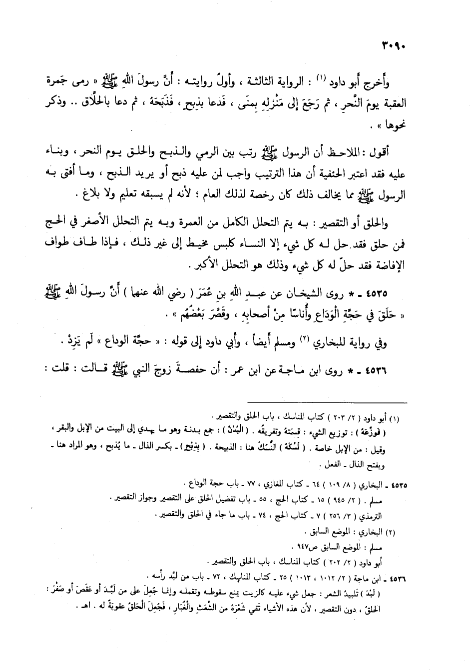 4535 - * روى الشيخان عن عبد الله بن عمر (رضي الله عنهما) أن رسول الله صلى الله عليه وسلم "حلق في حجة الوداع وأناساً من أصحابه، وقصر بعضهم".