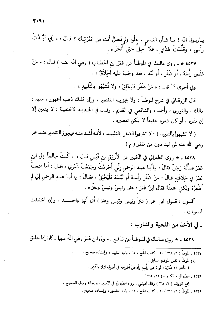 4537 - * روى مالك في الموطأ عن عمر بن الخطاب (رضي الله عنه) قال: "مَنْ عقص رأسهُ، أو ضفرَ، أو لبَّدَ، فقد وجب عليه الحِلاقُ".