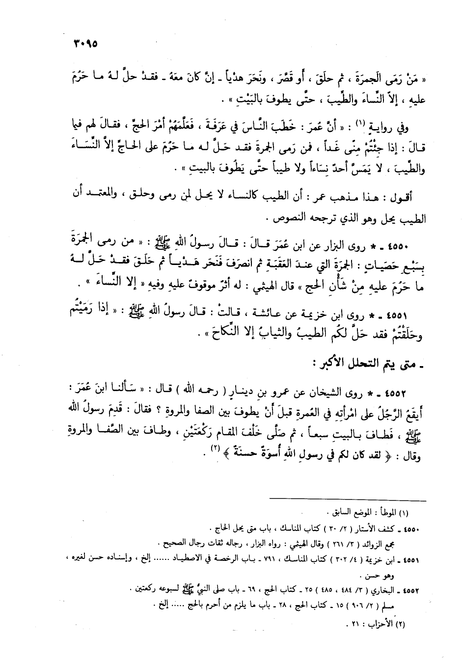 4550 - * روى البزار عن ابن عمر قال: قال رسول الله صلى الله عليه وسلم: "من رمى الجمرة بسبعِ حصياتٍ: الجمرة التي عند العقبةِ ثم انصرف فنحر هدياً ثم حلق فقد حل له ما حرُمَ عليه من شأن الحج" قال الهيثمي: له أثرٌ موقوفٌ عليه وفيه "إلا النساء".