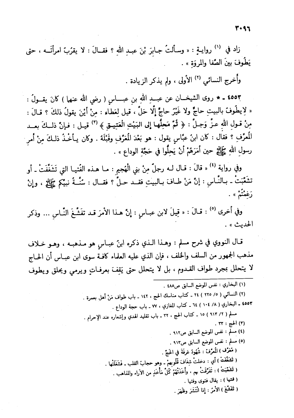4553 - * روى الشيخان عن عبد الله بن عباس (رضي الله عنهما) كان يقول: "لا يطوفُ بالبيت حاج ولا غيرُ حاج إلا حل، قيل لعطاء: من أين يقول ذلك؟ قال: منْ قول الله عز وجل: {ثُمَّ مَحِلُّهَا إِلَى الْبَيْتِ الْعَتِيقِ} (3) قيل: فإن ذلك بعد المُعرَّفِ؟ فقال: كان ابن عباسٍ يقول: هو بعْدَ المُعَرَّفِ وقبْلَهُ. وكان يأخْذُ ذلك من أمرِ رسول الله صلى الله عليه وسلم حين أمرهُمْ أن يحِلُّوا في حجةِ الوداع".