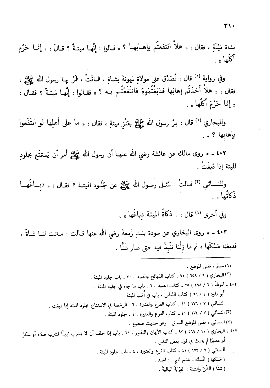 403 - * روى البخاري عن سودة بنت زمعة رضي الله عنها قالت: ماتت لنا شاةٌ، فدبغنا مسكها، ثم ما زلنا ننبِذُ فيها حتى صار شَنًّا.