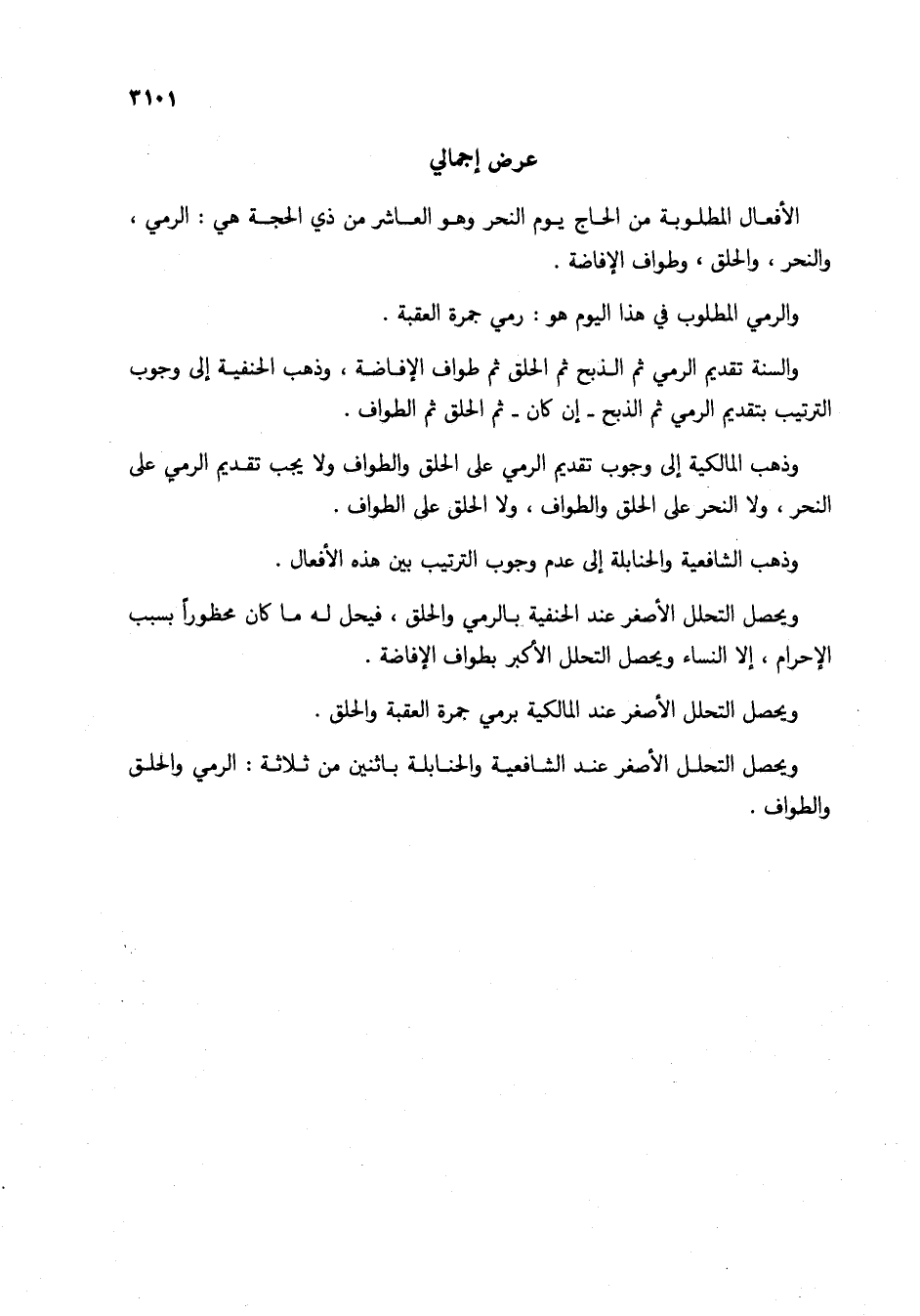 والسنة تقديم الرمي ثم الذبح ثم الحلق ثم طواف الإفاضة، وذهب الحنفية إلى وجوب الترتيب بتقديم الرمي ثم الذبح - إن كان- ثم الحلق ثم الطواف.