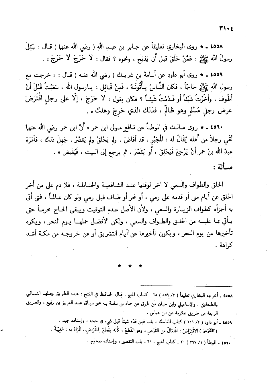 4558 - * روى البخاري تعليقاً عن جابر بن عبد الله (رضي الله عنهما) قال: سُئلَ رسول الله صلى الله عليه وسلم: عَمَّنْ حلق قبل أن يذبح، ونحوه؟ فقال: لا حرج لا حرج".