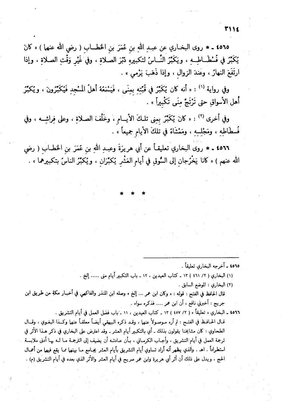 4565 - * روى البخاري عن عبد الله بن عمر بن الخطاب (رضي الله عنهما) "كان يُكبرُ في فُسطاطِه، ويكبرُ الناس لتكبيره دُبُر الصلاة، وفي غير وقت الصلاة، وإذا ارتفع النهار، وعند الزوال، وإذا ذهب يرْمي".
