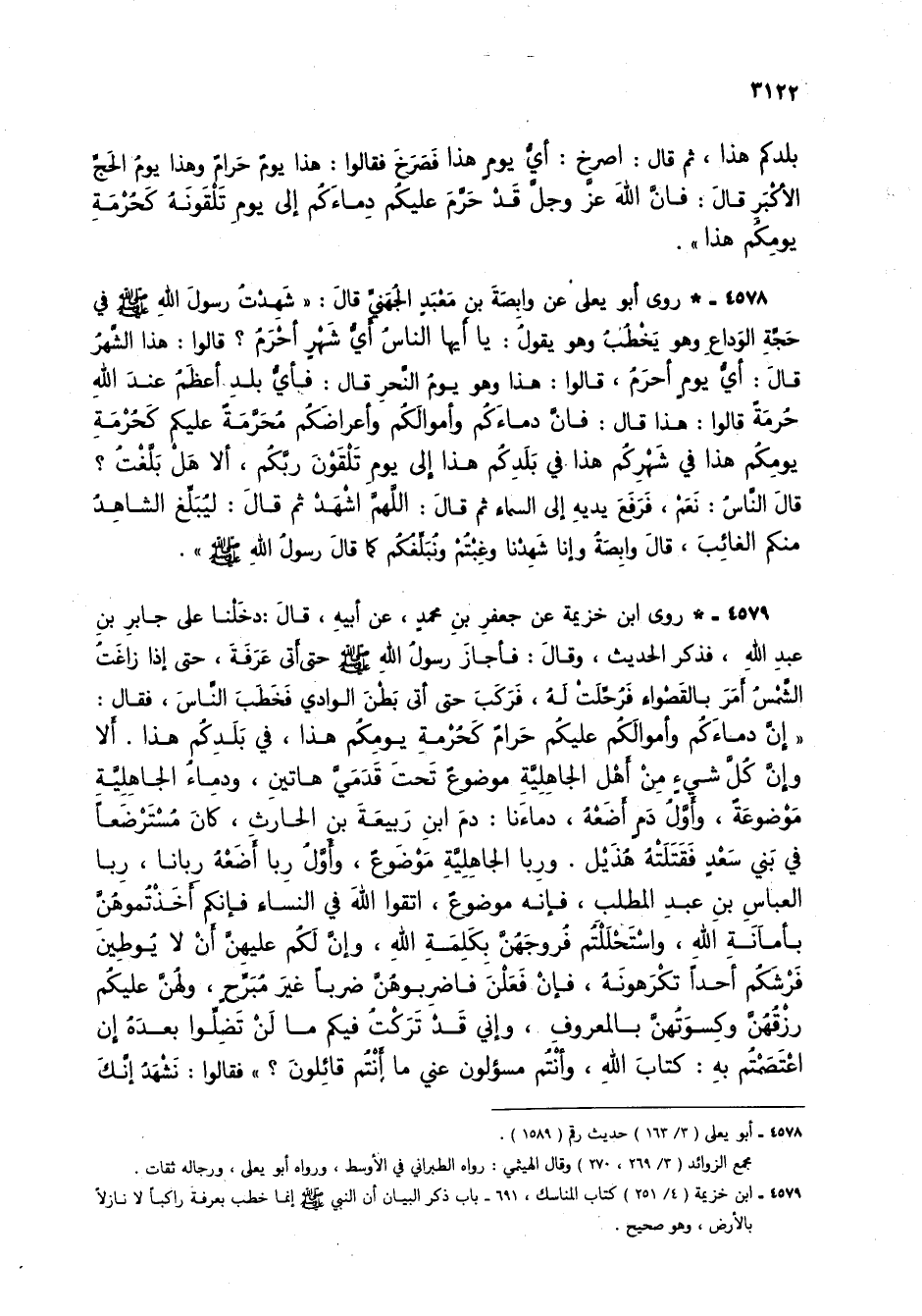 4578 - * روى أبو يعلي عن وابصة بن معبد الجهني قال: "شهدتُ رسول الله صلى الله عليه وسلم في حجة الوداع وهو يخطب وهو يقول: يا أيها الناس أي شهرٍ أحرمُ؟ قالوا: هذا الشهر قال: أي يومٍ أحرمُ، قالوا: هذا وهو يوم النحر قال: فأيُّ بلد أعظمُ عند الله حرمةً قالوا: هذا قال: فإن دماءكم وأموالكم وأعراضكم محرمةٌ عليكم كحرمةِ يومكم هذا في شهركم هذا في بلدكم هذا إلى يوم تلقون ربكم، ألا هل بلغت؟ قال الناس: نعم، فرفع يديه إلى السماء ثم قال: اللهم اشهدْ ثم قال: ليُبلغ الشاهدُ منكم الغائب، قال وابصةُ وإنا شهدنا وغِبْتُمْ ونُبَلِّغْكُم كما قال رسول الله صلى الله عليه وسلم".