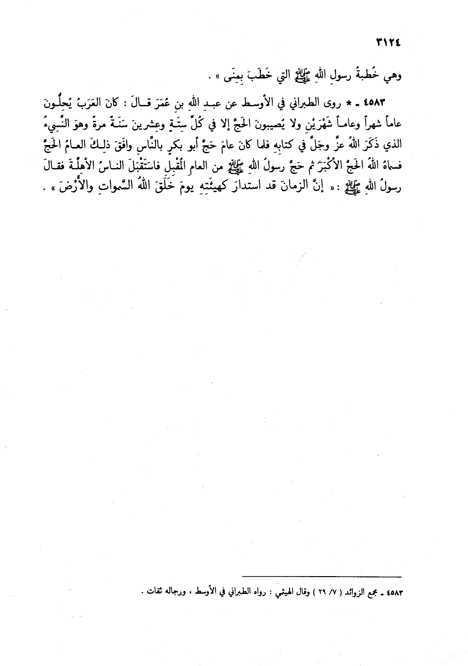 4583 - * روى الطبراني في الأوسط عن عبد الله بن عمر قال: كان العربُ يُحِلُّون عاماً شراً وعاماً شهرين ولا يُصيبون الحج إلا في كل ستةٍ وعشرين سنةً مرةً وهو النسيءُ الذي ذكر الله عز وجل في كتابه فلما كان عام حجَّ أبو بكر بالناس وافق ذلك العام الحج فسماه الله الحج الأكبر ثم حج رسول الله صلى الله عليه وسلم من العام المقبل فاستقبل الناس الأهلةَ فقال رسول الله صلى الله لعيه وسلم: "إن الزمان قد استدار كهيئته يوم خلق الله السموات والأرض" (1).