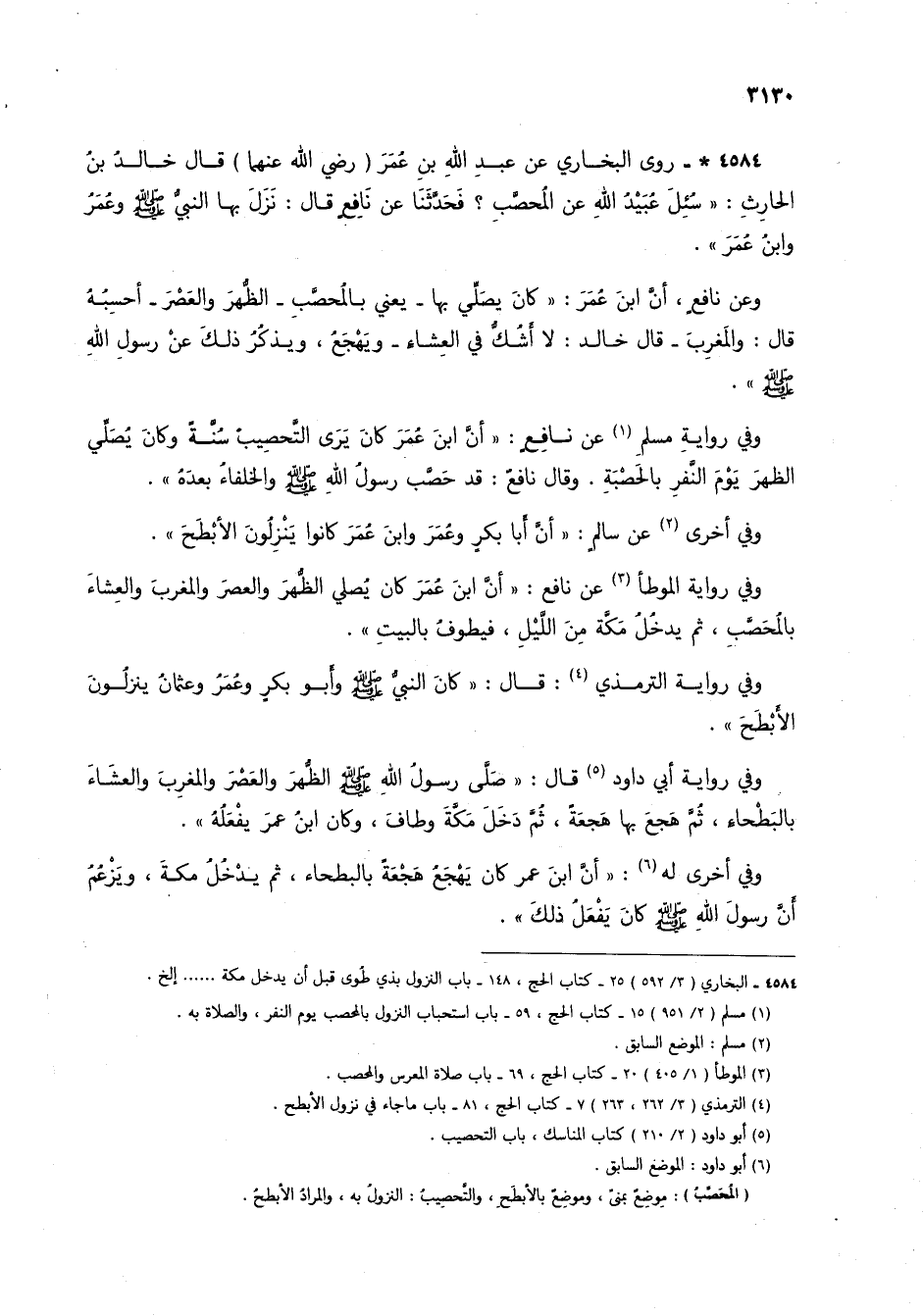4584 - * روى البخاري عن عبد الله بن عمر (رضي الله عنهما) قال خالد بن الحارث: "سُئل عبيد الله عن المحصب؟ فحدثنا عن نافعٍ قال: نزل بها النبي صلى الله عليه وسلم وعمرُ وابن عمر".