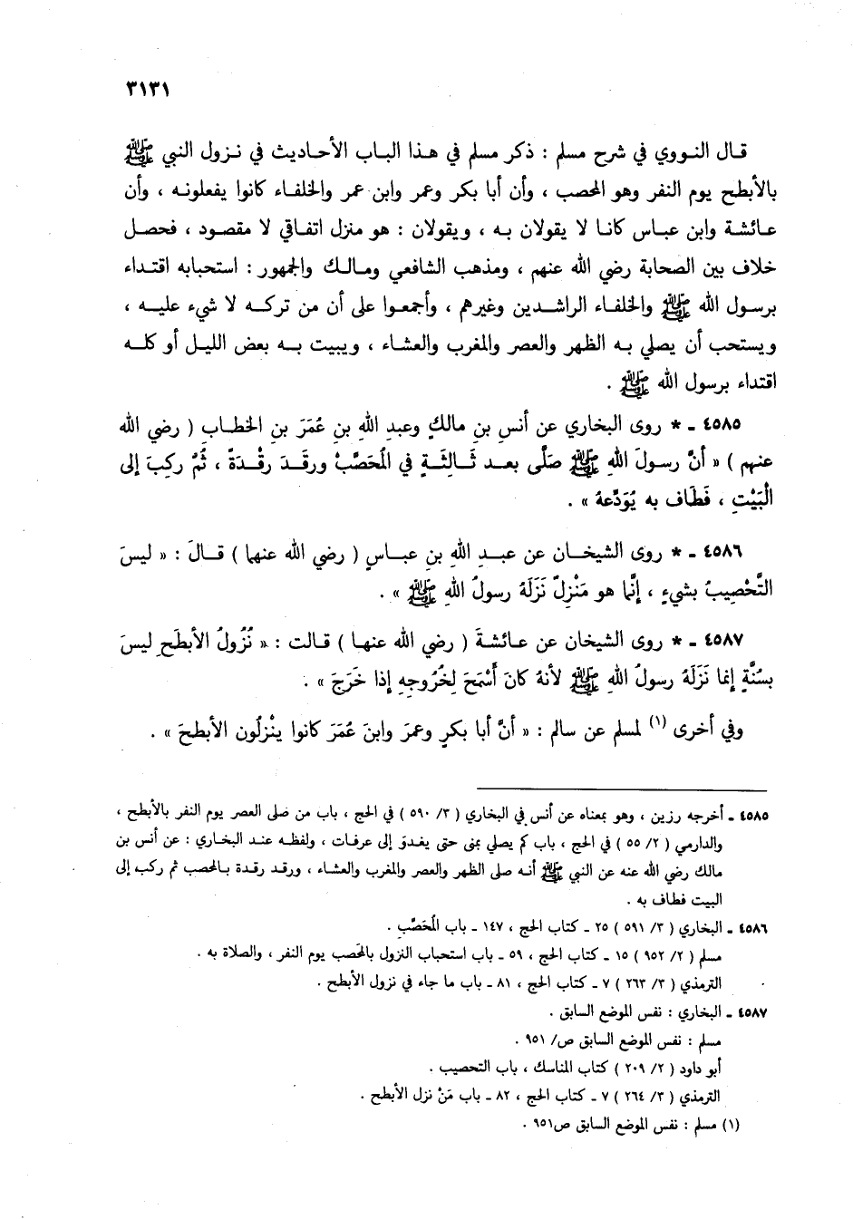 4585 - * روى البخاري عن أنس بن مالك وعبد الله بن عمر بن الخطاب (رضي الله عنهم) "أن رسول الله صلى الله عليه وسلم بعد ثالثةٍ في المحصبْ ورقد رقدةً، ثم ركب إلى البيت، فطاف به يُودِّعهُ".
