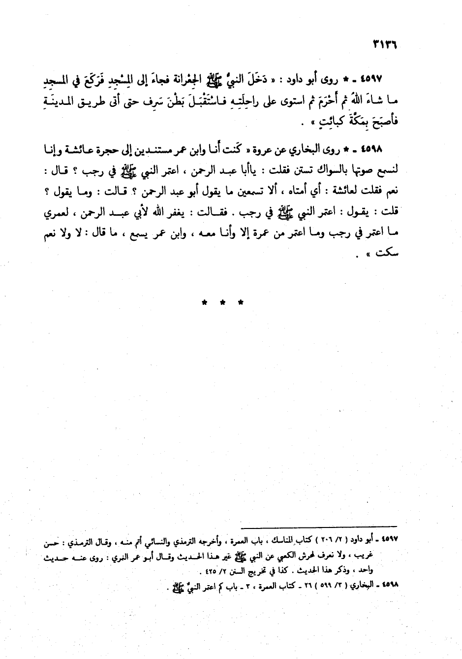 4597 - * روى أبو داود: "دخل النبي صلى الله عليه وسلم الجعرانة فجاء إلى المسجد فركع في المسجد ما شاء الله ثم احرم ثم استوى على راحلته فاستقبل بطن سرف حتى أتى طريق المدينة فأصبح بمكة كبائتٍ".