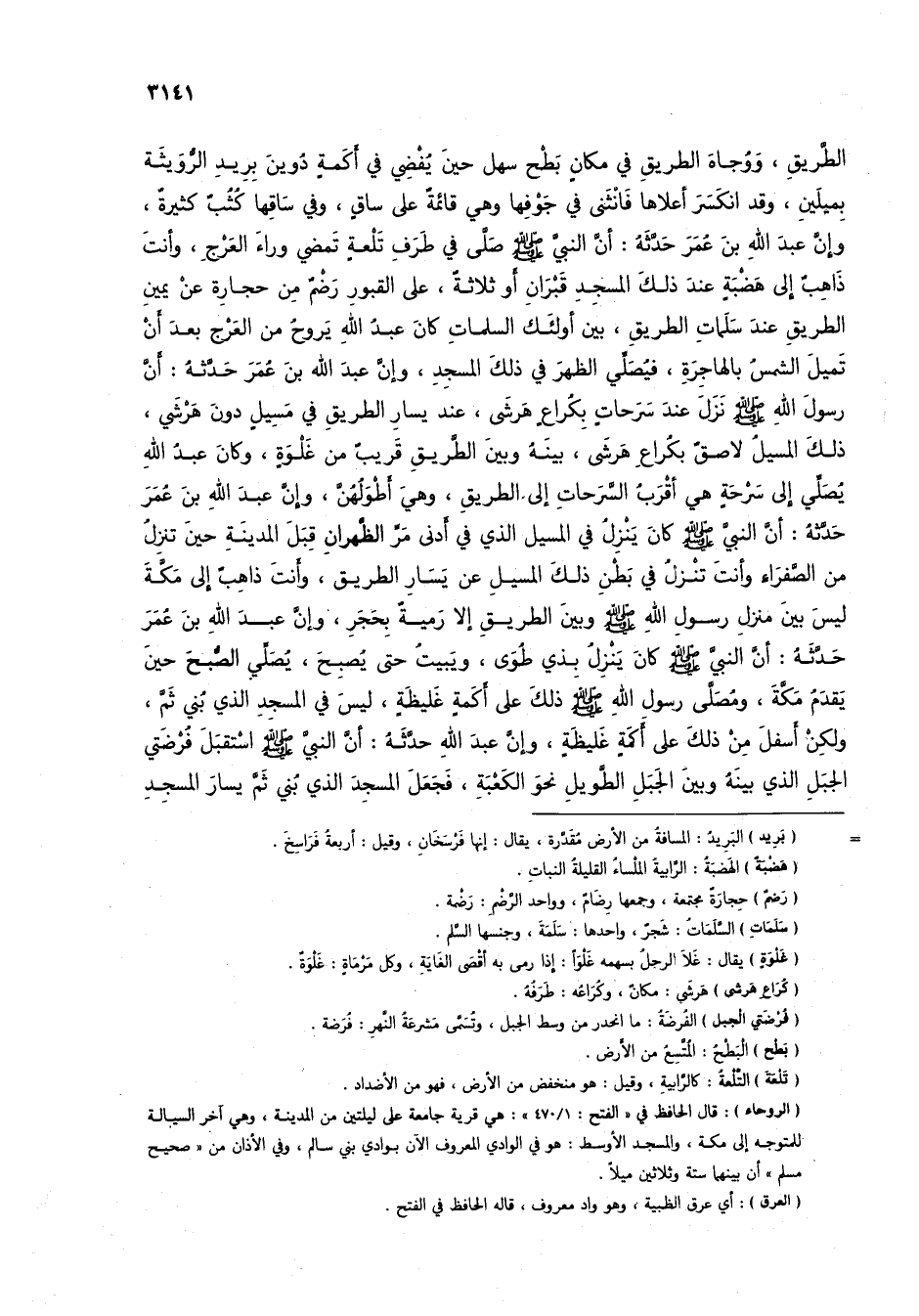 الطريق، ووُجاه الطريق في مكان بطح سهل حين يُفضِي في أكمةٍ دوين بريدِ الرُّويثة بميلين، وقد انكسر أعلاها فانثنى في جوفها وهي قائمة على ساقٍ، وفي ساقها كُثُبٌ كثيرةٌ، وإن عبد الله بن عمر حدثه: أن النبي صلى الله عليه وسلم صلى في طرف تلعةٍ تمضي وراء العرْجِ، وأنت ذاهبٌ إلى هضبةٍ عند ذلك المسجد قبران أو ثلاثةٌ، على القبور رَضْمٌ من حجارة عن يمين الطريق عند سلمات الطريٌ، بين أولئك السلمات كان عبد الله يروح من العرج بعد أن تميل الشمس بالهاجرة، فيُصلي الظهر في ذلك المسجد، وإن عبد الله بن عمر حدثه: أن رسول الله صلى الله عليه وسلم نزل عند سرحاتٍ بكُراعٍ هرشى، عند يسار الطريق في مسيل دون هرشي، لك المسيل لاصقٌ بكُراع هرشى، بينه وبين الطريق قريبٌ من غَلْوةٍ، وكان عبد الله يُصلي إلى سرحةٍ هي أقرب السرحات إلى الطريق، وهي أطولهن، وإن عبد الله بن عمر حدثه: أن النبي صلى الله عليه وسلم كان ينزل في المسيل الذي في أدنى مر الظهران قِبَلَ المدينةِ حين تنزلُ من الصفراء وأنت تنزل في بطن ذلك المسيل عن يسار الطريق، وأنت ذاهبٌ إلى مكة ليس بين منزل رسول الله صلى الله عليه وسلم وبين الطريق إل رميةٌ بحجرِ، وإن عبد الله بن عمر حدثه: أن النبي صلى الله عليه وسلم كان ينزل بذي طُوى، ويبيت حتى يُصبح، يُصلي الصبح حين يقدم مكة، ومُصلى رسول الله صلى الله لعيه وسلم ذلك على أكمةٍ غليظةٍ، ليس في المسجد الذي بُني ثَمَّ، ولكن أسفل من ذلك على أكمةٍ غليظةٍ، وإن عبد الله حدثه (1): أن النبي صلى الله عليه وسلم استقبل فُرضتي الجبل الذي بينه وبين الجبل الطويل نحو الكعبة، فجعل المسجد الذي بُني ثم يسار المسجد