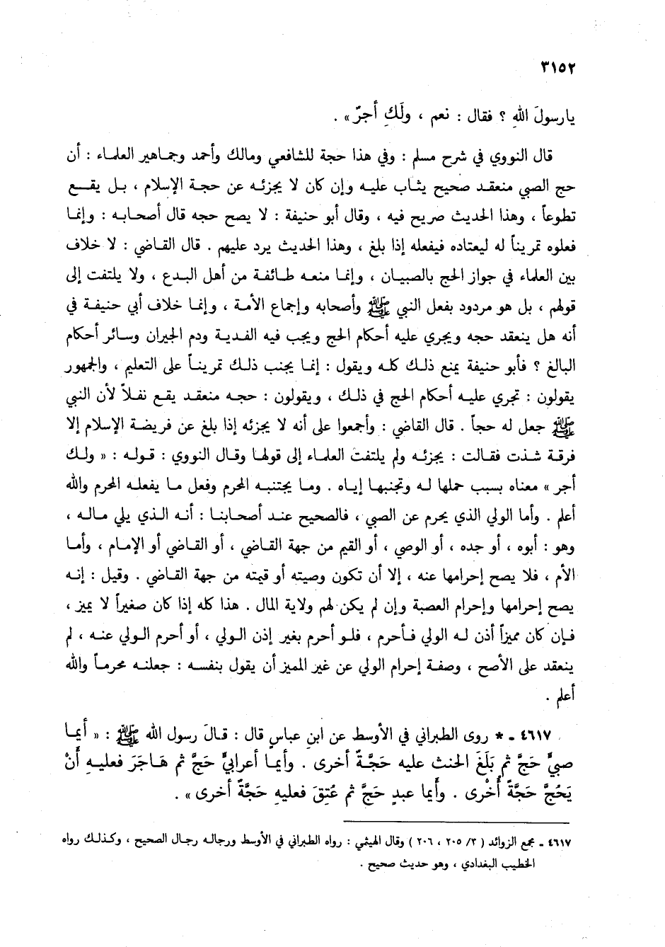 4617 - * روى الطبراني في الأوسط عن ابن عباس قال: قال رسول الله صلى الله عليه وسلم: "أيما صبي حجَّ ثم بلغ الحنث عليه حجةٌ أخرى. وأيما أعرابيٍّ حجَّ ثم هاجر فعليه أنْ يحُجَّ حجةً أخرى. وأيما عبدٍ حجَّ ثم عُتِقَ فعليه حجةٌ أخرى" (1).