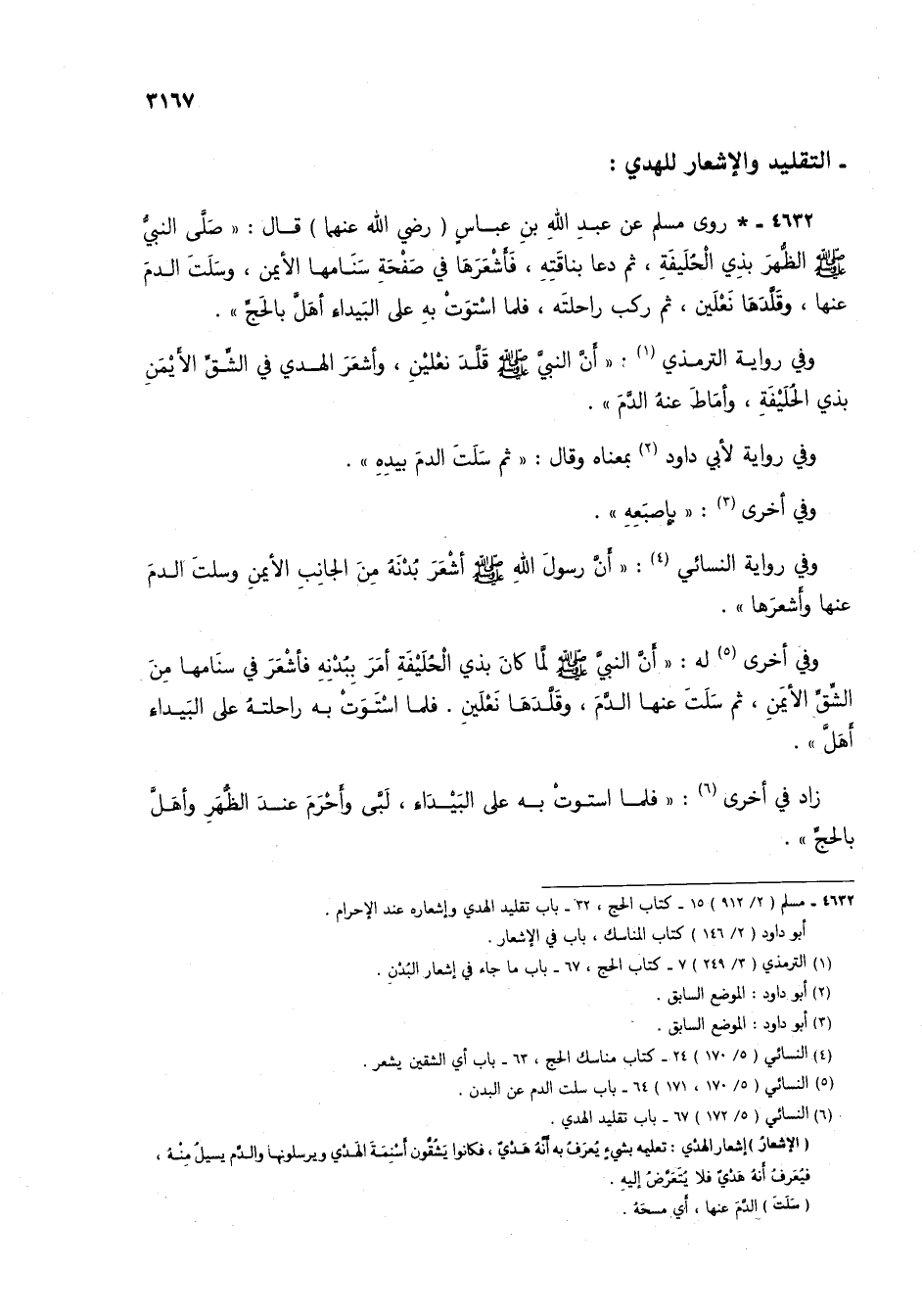 4632 - * روى مسلم عن عبد الله بن عباس (رضي الله عنهما) قال: "صلى النبي صلى الله عليه وسلم الظهر بذي الحُليفةِ، ثم دع بناقته، فأشعرها في صفحة سنامها الأيمن، وسلت الدم عنها، وقلدها نعلين، ثم ركب راحلته، فلما استوتْ به على البيداء أهل بالحج".