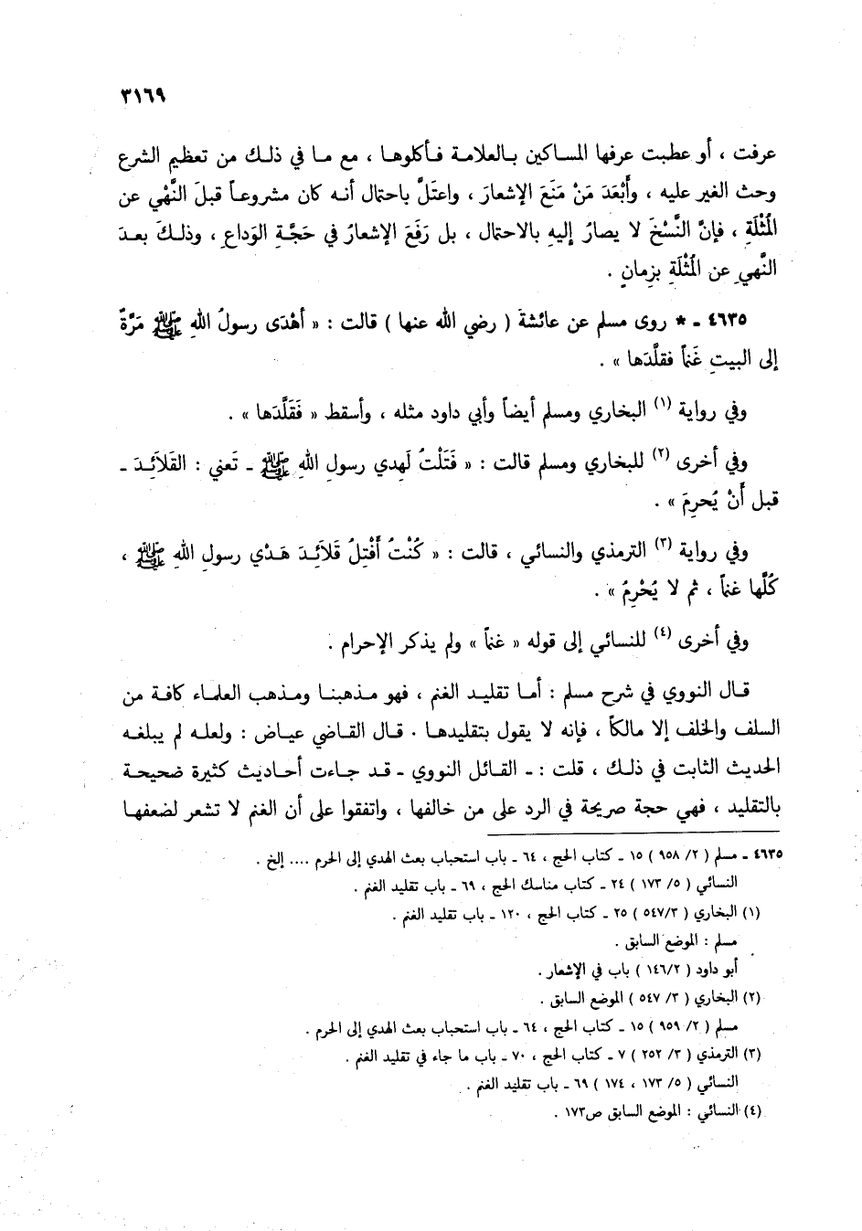 4635 - * روى مسلم عن عائشة (رضي الله عنها) قالت: "أهدى رسول الله صلى الله عليه وسلم مَرةٌ إلى البيت غنماً فقلدها".