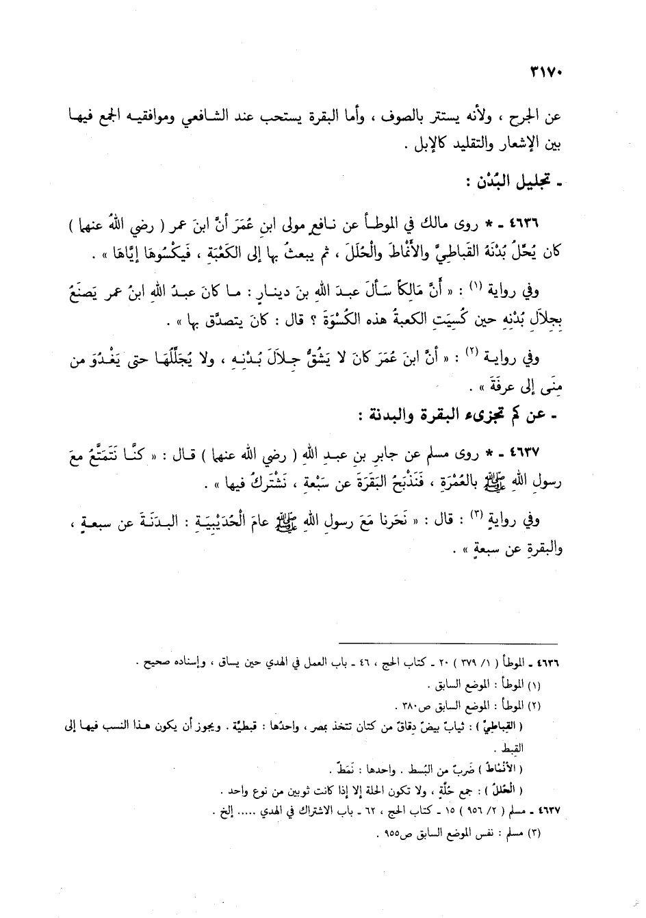 4636 - * روى مالك في الموطأ عن نافعٍ مولى ابن عمر أن ابن عمر (رضي الله عنهما) كان يُحل بدنُه القباطي والأنماط والحُلل، ثم يبعثُ بها إلى الكعبةِ، فيكسُوها إياها".