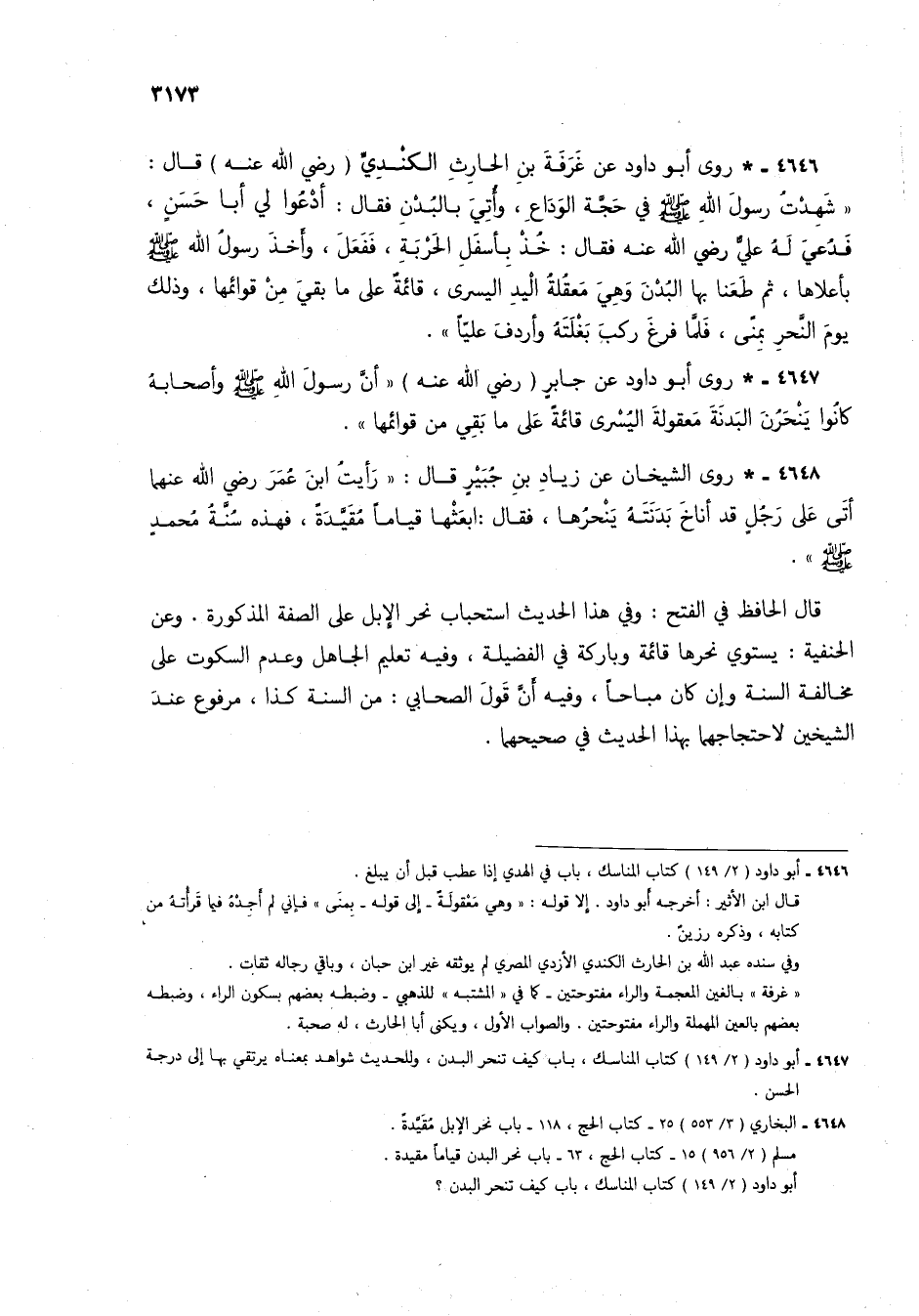4647 - * روى أبو داود عن جابر (رضي الله عنه) "أن رسول الله صلى الله عليه وسلم وأصحابه كانوا ينحرُنَ البدنة معقولة اليُسْرى قائمةً على ما بقي من قوائمها".