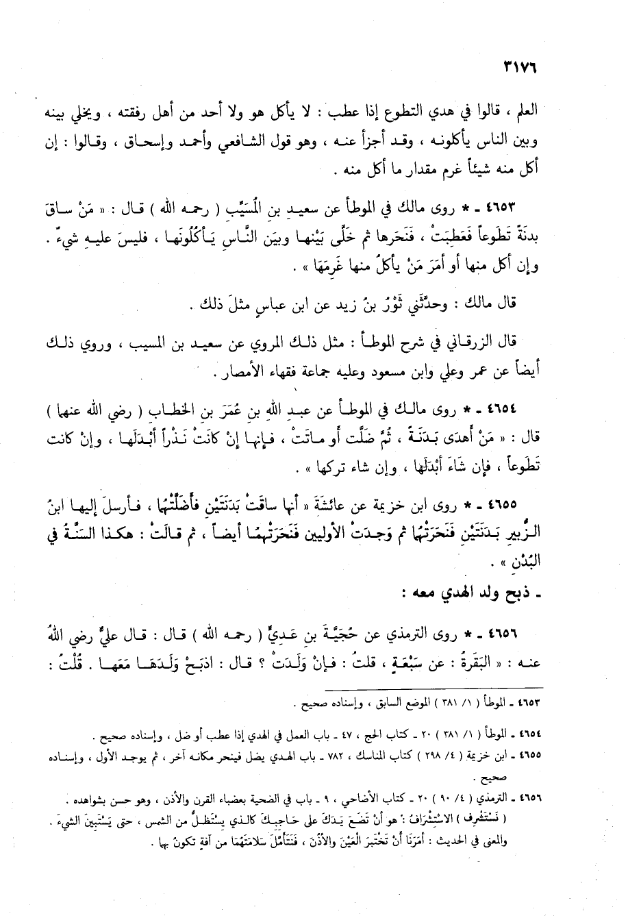 4653 - * روى مالك في الموطأ عن سعيد بن المسيب (رحمه الله) قال: "من ساق بدنة تطوعاً فعطبتْ، فنحرها ثم خلي بينها وبين الناس يأكلونها، فليس عليه شيء. وإن أكل منها أو أمر من يأكل منها غرمها".