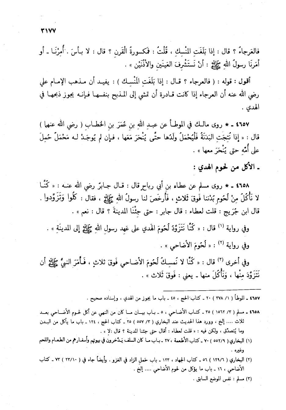 4658 - * روى مسلم عن عطاء بن أبي رباح قال: قال جابر رضي الله عنه: "كُنَّا لا أنكل من لحوم بُدننا فوق ثلاثٍ، فأرخص لنا رسول الله صلى الله عليه وسلم، فقال: كلُوا وتزودوا. قال ابن جريج: قلت لعطاء: قال جابر: حتى جئنا المدينة؟ قال: نعم".