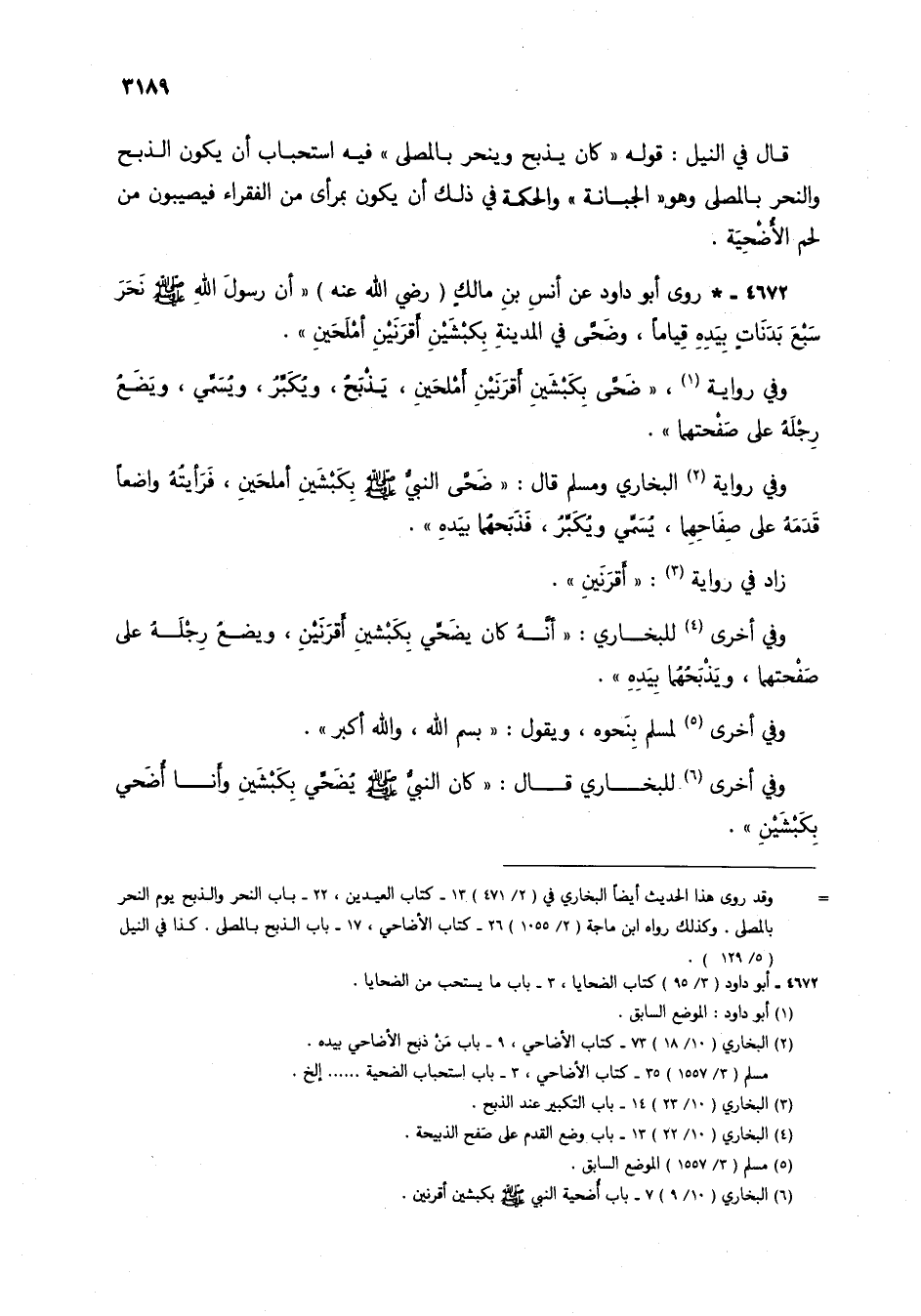 وفي أخرى (4) للبخاري: "أنه كان يضحي بكبشين أقرنين، ويضع رجلهُ على صفحتهما، ويذبحهما بيده".