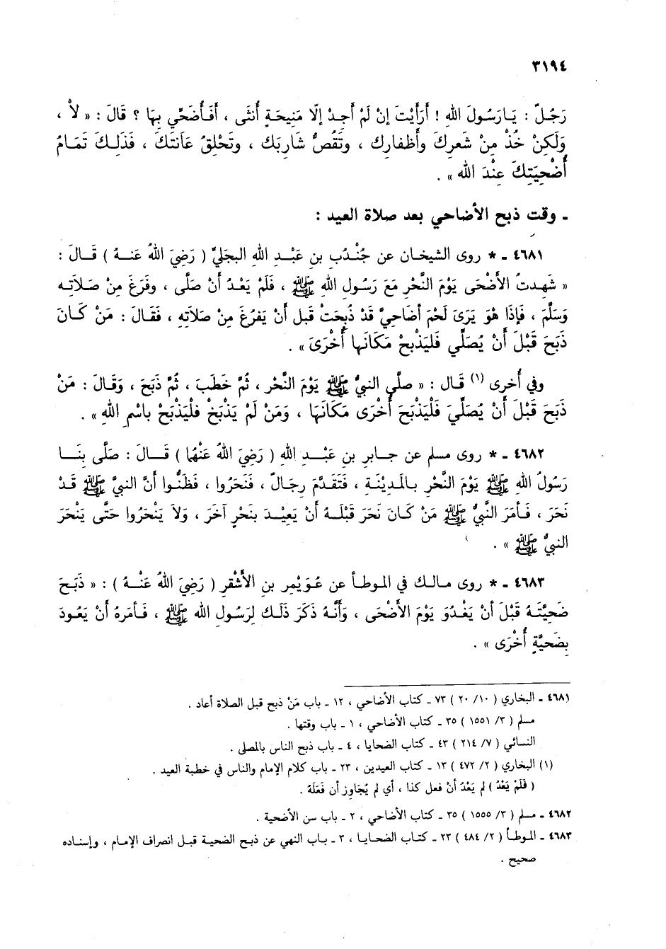 4682 - * روى مسلم عن جابر بن عبد الله (رضي الله عنهما) قال: صلى بنا رسول الله صلى الله عليه وسلم يوم النحر بالمدينة، فتقدم رجالٌ، فنحروا، فظنوا أن النبي صلى الله عليه وسلم قد نحر، فأمر النبي صلى الله عليه ومسلم من كان نحر قبلهُ أنْ يعيد بنحرٍ آخر، ولا ينحروا حتى ينحر النبي صلى الله عليه وسلم.
