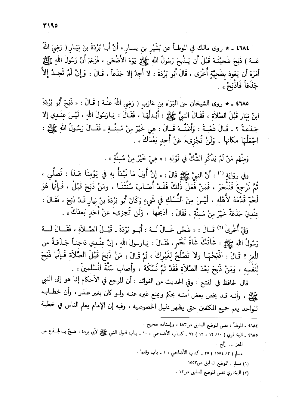 4684 - * روى مالك في الموطأ عن بُشير بن يسارٍ "أن أبا بُردة بن نيارٍ (رضي الله عنه) ذبح ضحيتهُ قبل أن يذبح رسول الله صلى الله عليه وسلم يوم الأضحى، فزعم أن رسول الله صلى الله عليه وسلم أمره أن يعُود بضحيةٍ أخرى، قال أبو بُردة: لا أجدُ إلا جذعاً، قال: وإنْ لم تجدْ إلا جذعاً فاذبحْ".
