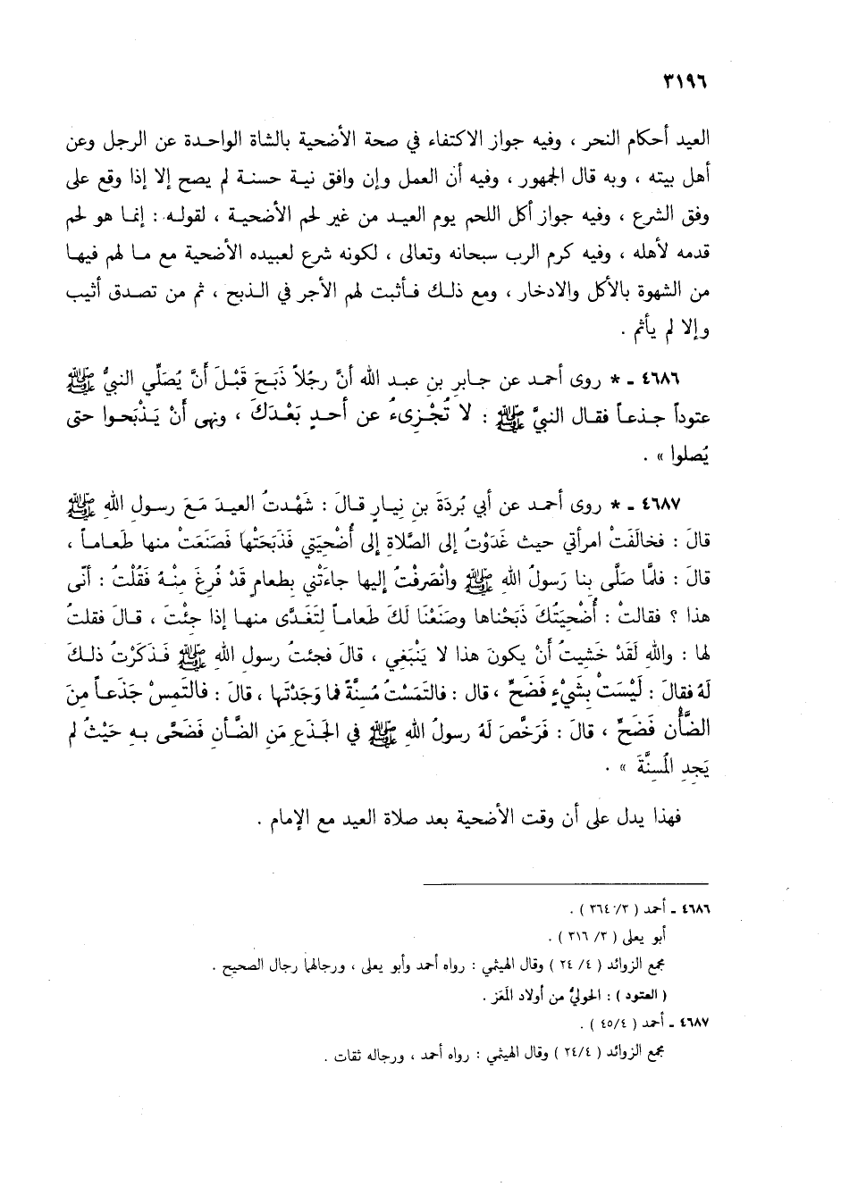 4686 - * روى أحمد عن جابر بن عبد الله أن رجلاً ذبح قبل أن يُصلي النبي صلى الله عليه وسلم عتوداً جذعاً فقال النبي صلى الله عليه وسلم: لا تجزيء عن أحدٍ بعدك، ونهى أن يذبحوا حتى يُصلوا".