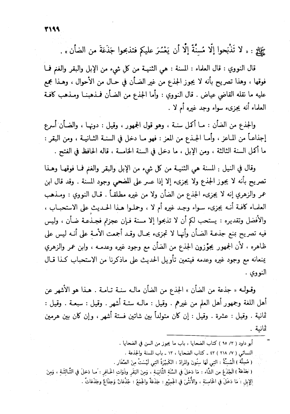 قال النووي: قال العلماء: المسنة: هي الثنية من كل شيء من الإبل والبقر والغنم فما فوقها، وهذا تصريح بأنه لا يجوز الجذع من غير الضأن في حال من الأحوال، وهذا مجمع عليه ما نقله القاضي عياض. قال النووي: وأما الجذع من الضأن فمذهبنا ومذهب كافة العلماء أنه يجزيء سواء وجد غيره أم لا.
