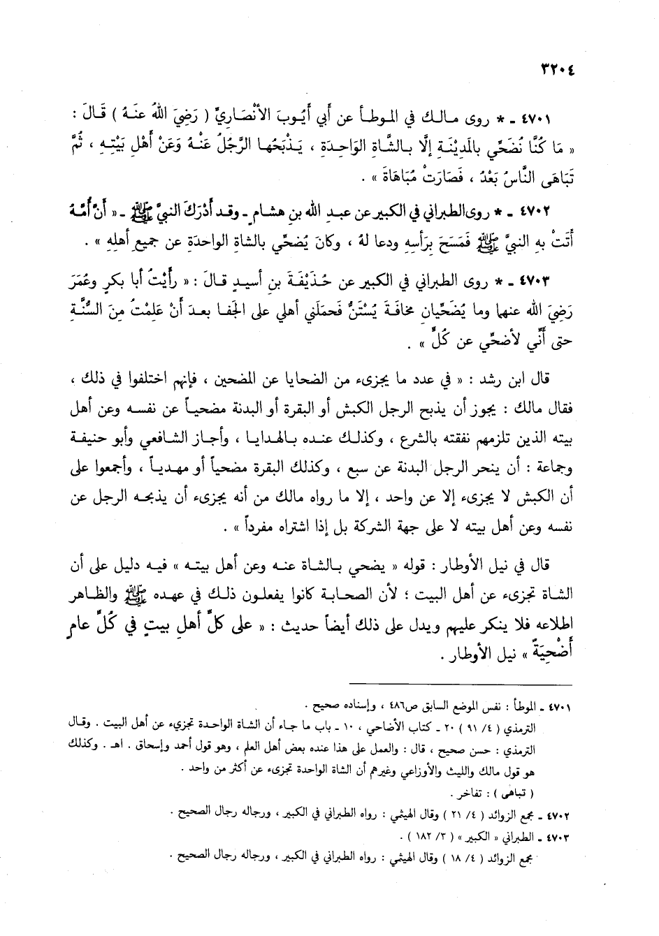 4701 - * روى مالك في الموطأ عن أبي أيوب الأنصاري (رضي الله عنه) قال: "ما كنا نضحي بالمدينة إلا بالشاة الواحدة، يذبحها الرجل عنه وعن أهل بيته، ثم تباهى الناس بعد، فصارت مباهاة".